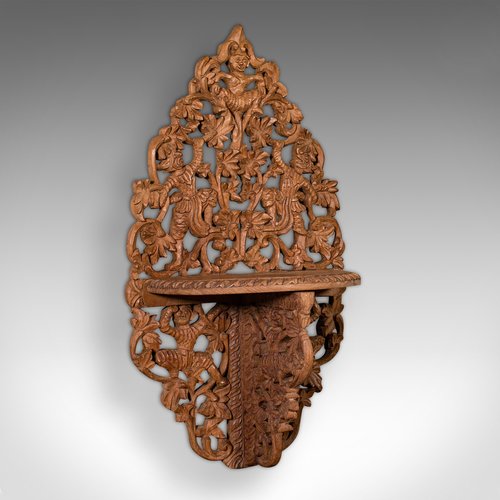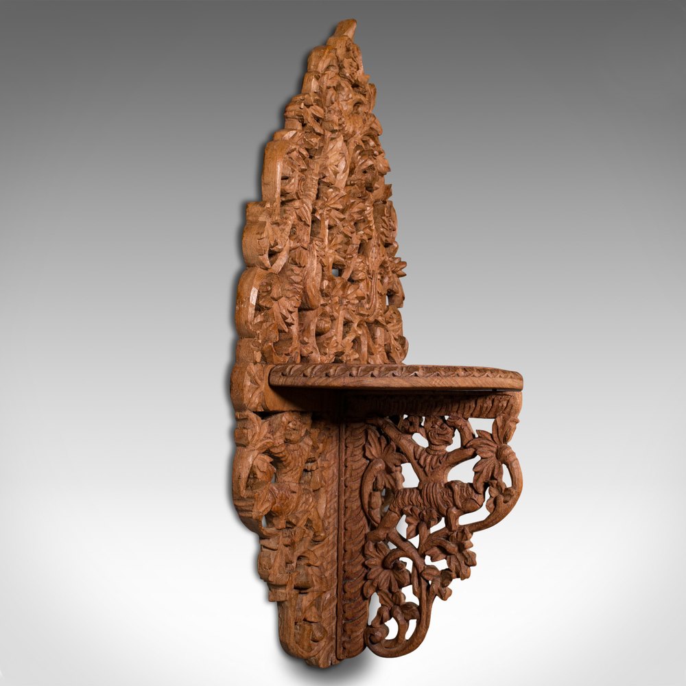 This is a vintage icon shelf. A Balinese, carved teak wall sconce or display shelf, dating to the late Art Deco period, circa 1940.Charmingly decorative mounted shelf, with ornate detail