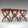 This is a set of 3 vintage nesting tables. An English flame mahogany and beech trio of occasional tables, dating to the mid 20th century, circa 1950.Beautifully appointed with serpentine forms, ideal for the lounge