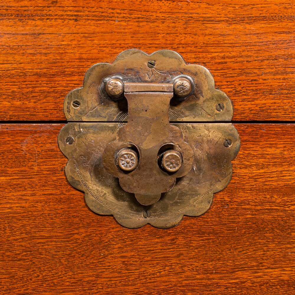 Stout lid held securely by large brass clasp, engraved with foliate detail