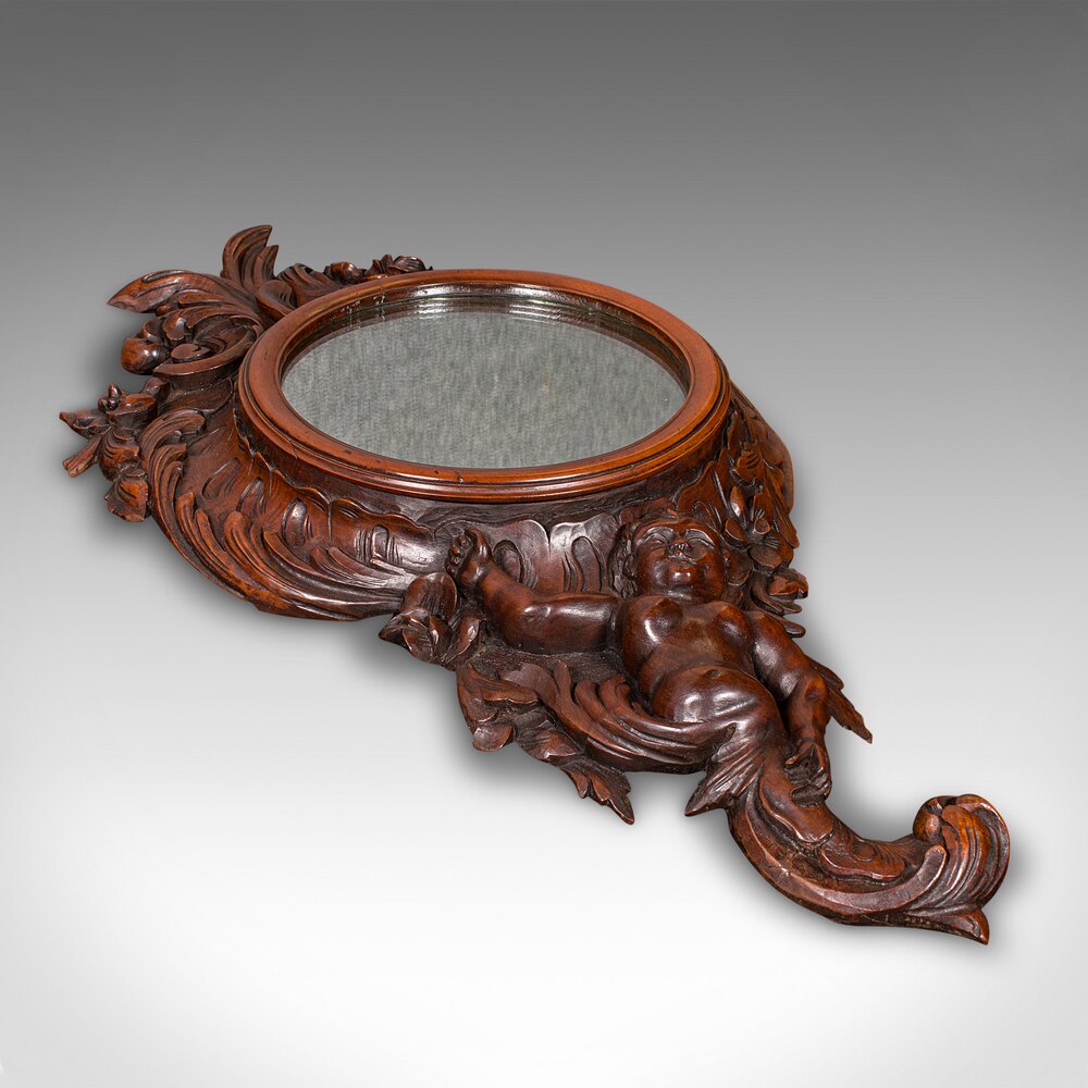 Features a captivating putto bust detail beneath the mirror, framed by a shaped lower apron