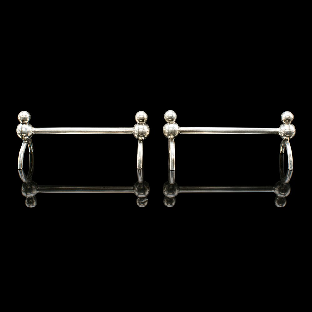 Our Stock # 25456This is a pair of small antique cutlery rests. An English, silver plated condiment spoon rack dating to the Edwardian period, circa 1910. Perfect for elevating the elegance of any dining arrangement, these charming spoon rests combine refined design with practical use.
