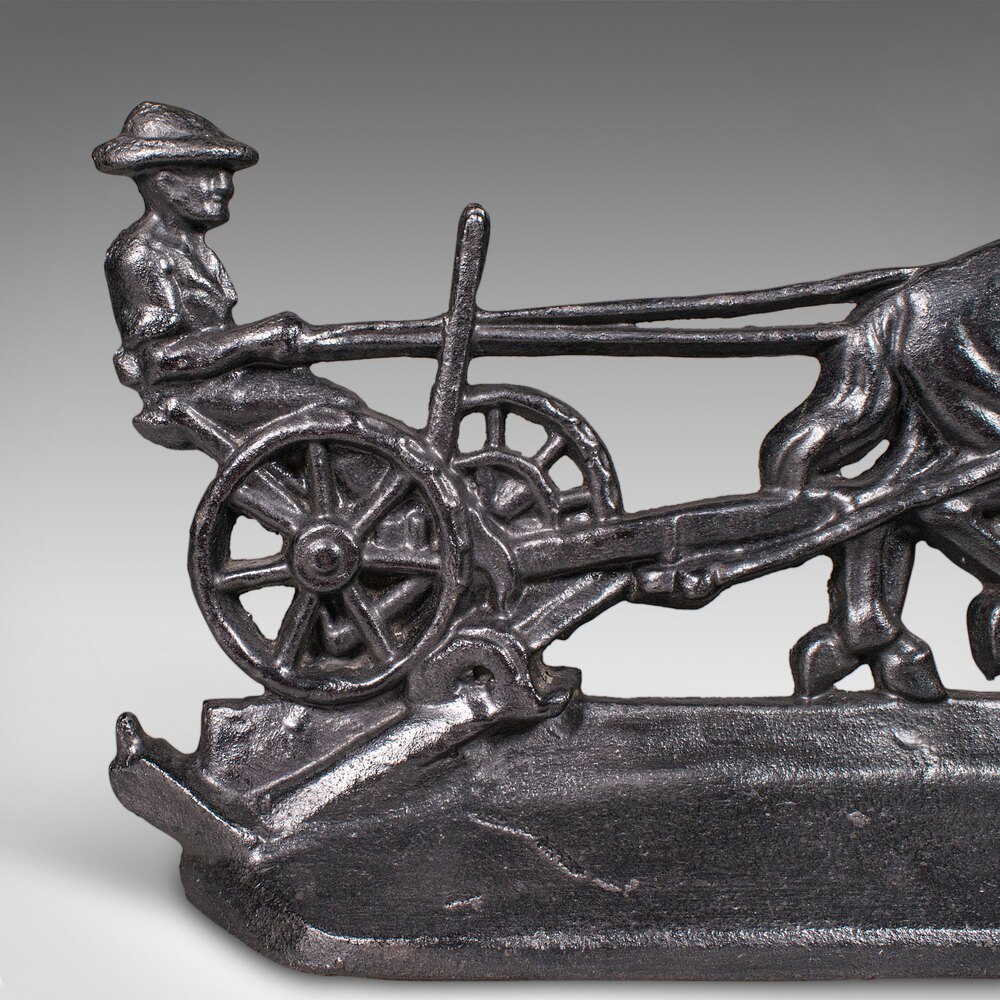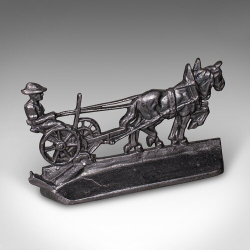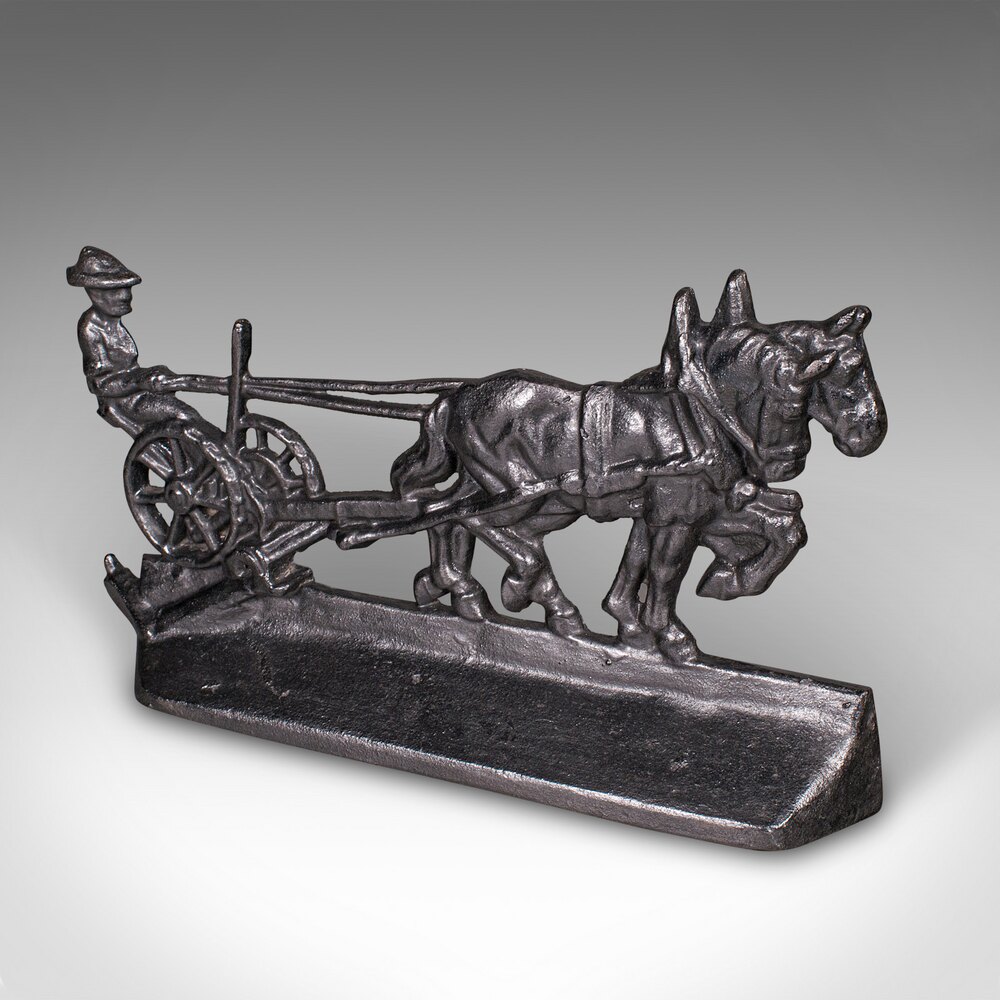 Our Stock # 25608This is an antique Ploughman doorstop. An English, cast iron farmhouse decorative door keeper with Shire horse interest, dating to the early Victorian period, circa 1850. A charming and substantial piece, it captures a delightful rural scene with fine period detail.
