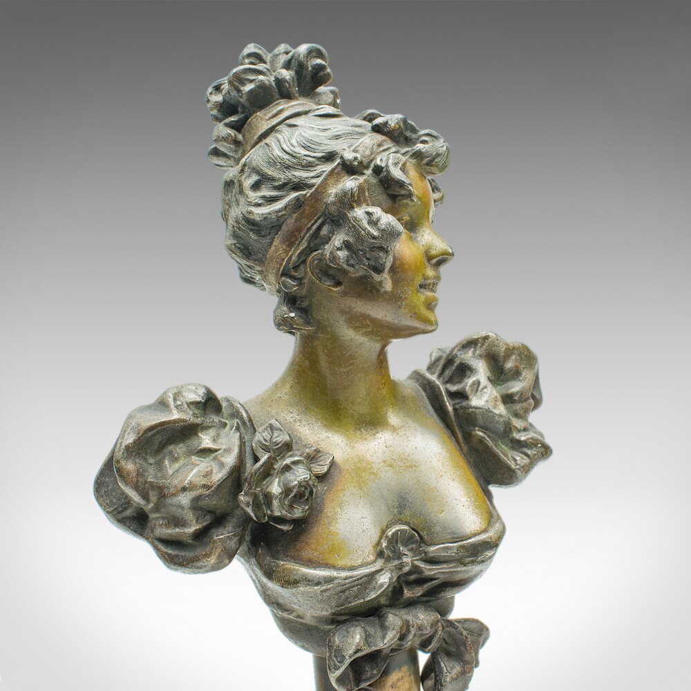 Our Stock # 25753This is a pair of antique figural bookends. A French, spelter bronze female bust in Art Nouveau taste, dating to the late Victorian period, circa 1900. Wonderfully expressive pieces with superb tonality and enduring fin de siècle charm.