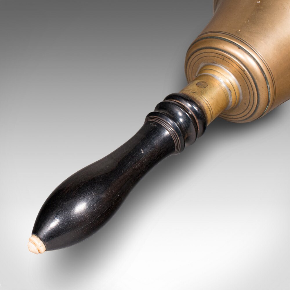Our Stock # 25754This is an antique schoolmaster's hand bell. An English, bronze and ebonised lignum vitae dinner chime, dating to the Edwardian period, circa 1910. A tactile and substantial example, offering a clear and resonant tone.