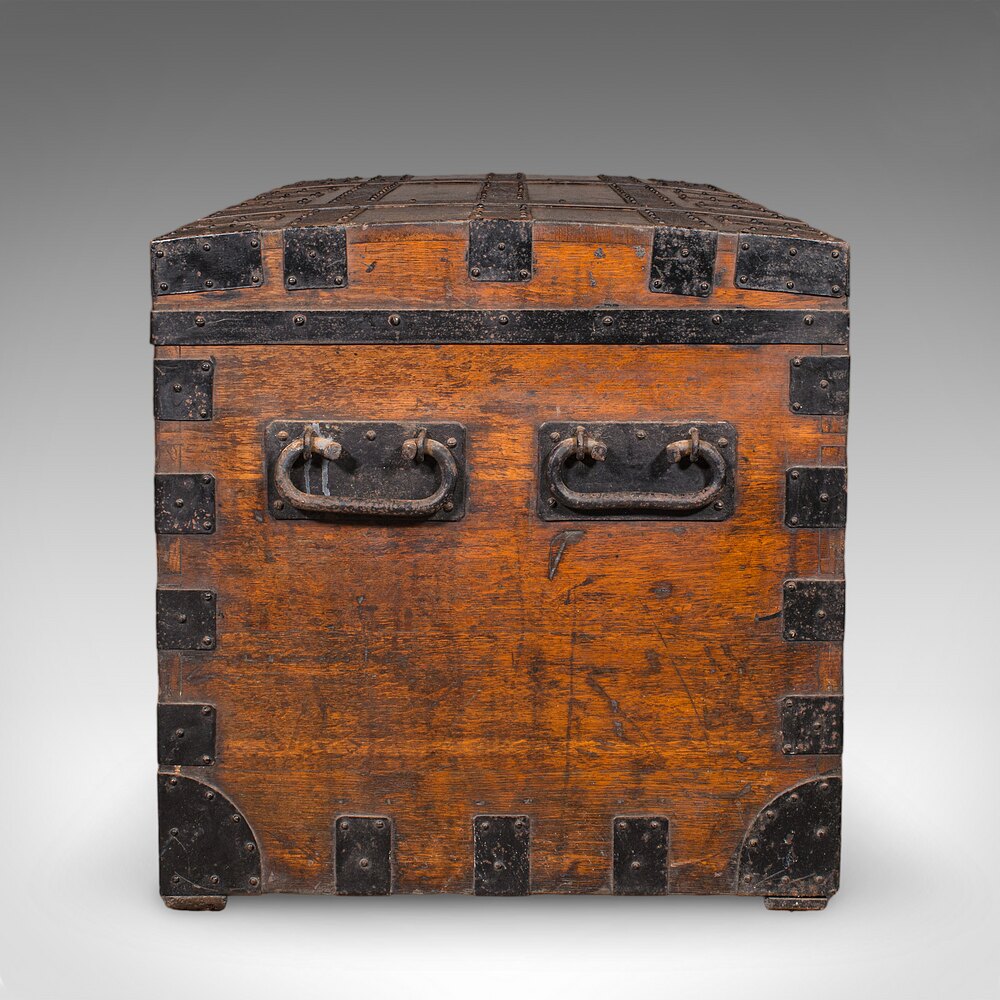 This is a magnificent oak and cast iron shipping trunk, offering outstanding character, provenance and decorative presence for the collector, study or refined interior. Solid joints and construction, delivered ready for the home.