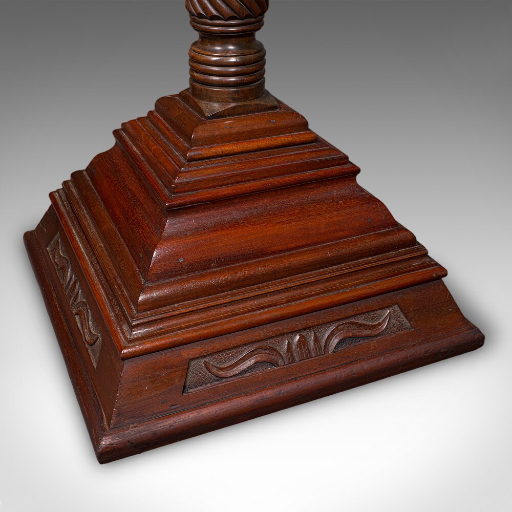 Our Stock # 25802This is a pair of large antique torchiere. An English, mahogany country house bust stand or jardiniere pedestal, dating to the late Victorian period, circa 1900. Excellent display furniture with impressive stature and the refined presence suited to a hotel, gallery or grand entrance hall.