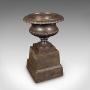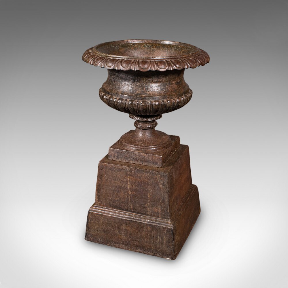 Our Stock # 25900This is a large pair of antique garden planters. An English, cast iron outdoor display urn from the time of the Great Exhibition, dating to the Victorian period, circa 1850.