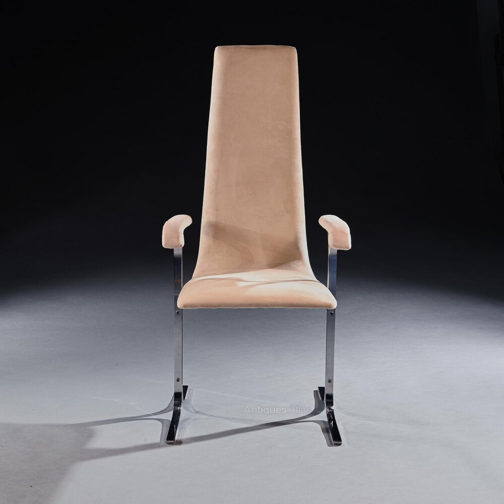 These fine chairs, unusual for being a set of 8, are a mid century design classic produced in England at the Pieff factory in Lye in the west midlands c.1976. Newly upholstered in a cream nubuck the tapering high backs of the chairs contrast beautifully with the chrome plated brass frames, spreading feet and arm supports, giving these pieces a very sculptural look and a relaxed yet luxurious aesthetic. These chairs are extremely comfortable and ideal for dining or in the office, the long back being flexible with adds to the comfort of these chairs.