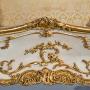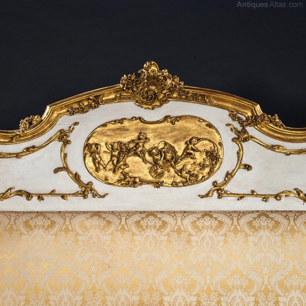 This superb quality king size bed is decorated throughout in a white and gilt scheme, the headboard having been upholstered in complementary gold coloured damask. Made around the turn of the 20th century, this piece is very much in the Louis XV style and is likely to have been made in Paris by one of the leading makers of the period. The asymmetrical scroll work is beautifully executed and well balanced and would have been intended to complement the boiserie of a bedroom of the time. It is interesting to think about this piece in the context of such landmark developments as the opening of the Ritz hotel in London in 1906, decorated largely in a similar French rococo revival style.