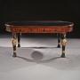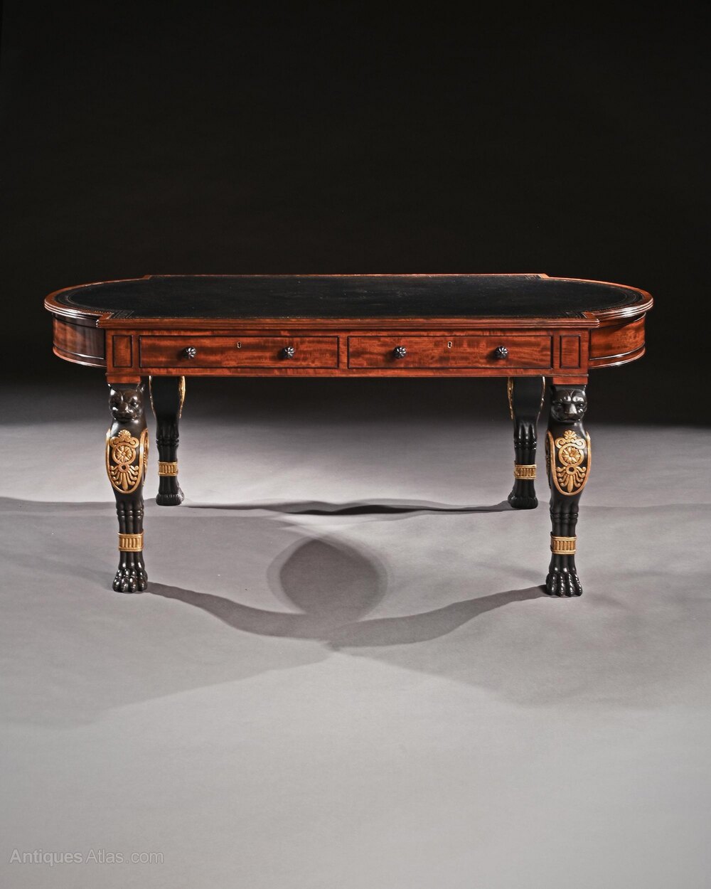An Important Regency period mahogany, ebonised and parcel gilt partners writing table on monopodia legs of exceptional quality and design, in the manner of George Smith, stamped Chas Norman, Labelled ‘Morning Library’.English, Regency period, Circa 1820.