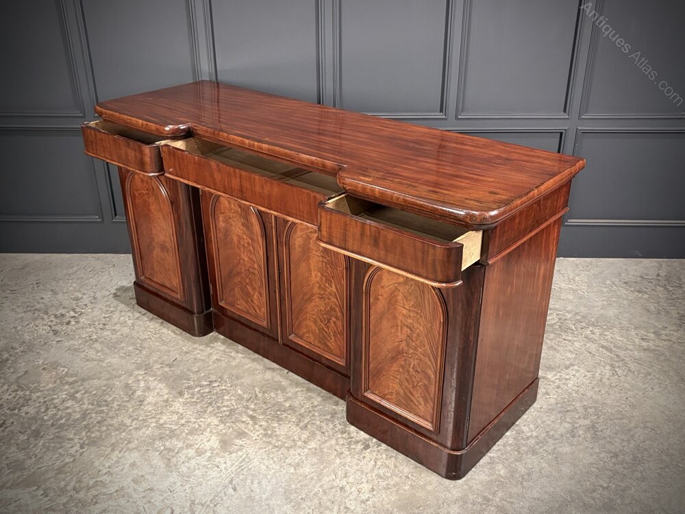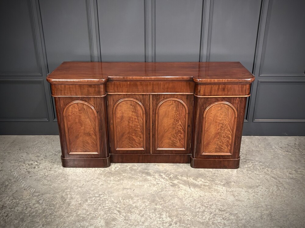 A fine quality Victorian mahogany sideboard of elegant inverted breakfront form, showcasing beautiful flame mahogany throughout.The piece features three drawers running along the top, above four arched panelled cupboard doors with striking flame mahogany figuring.