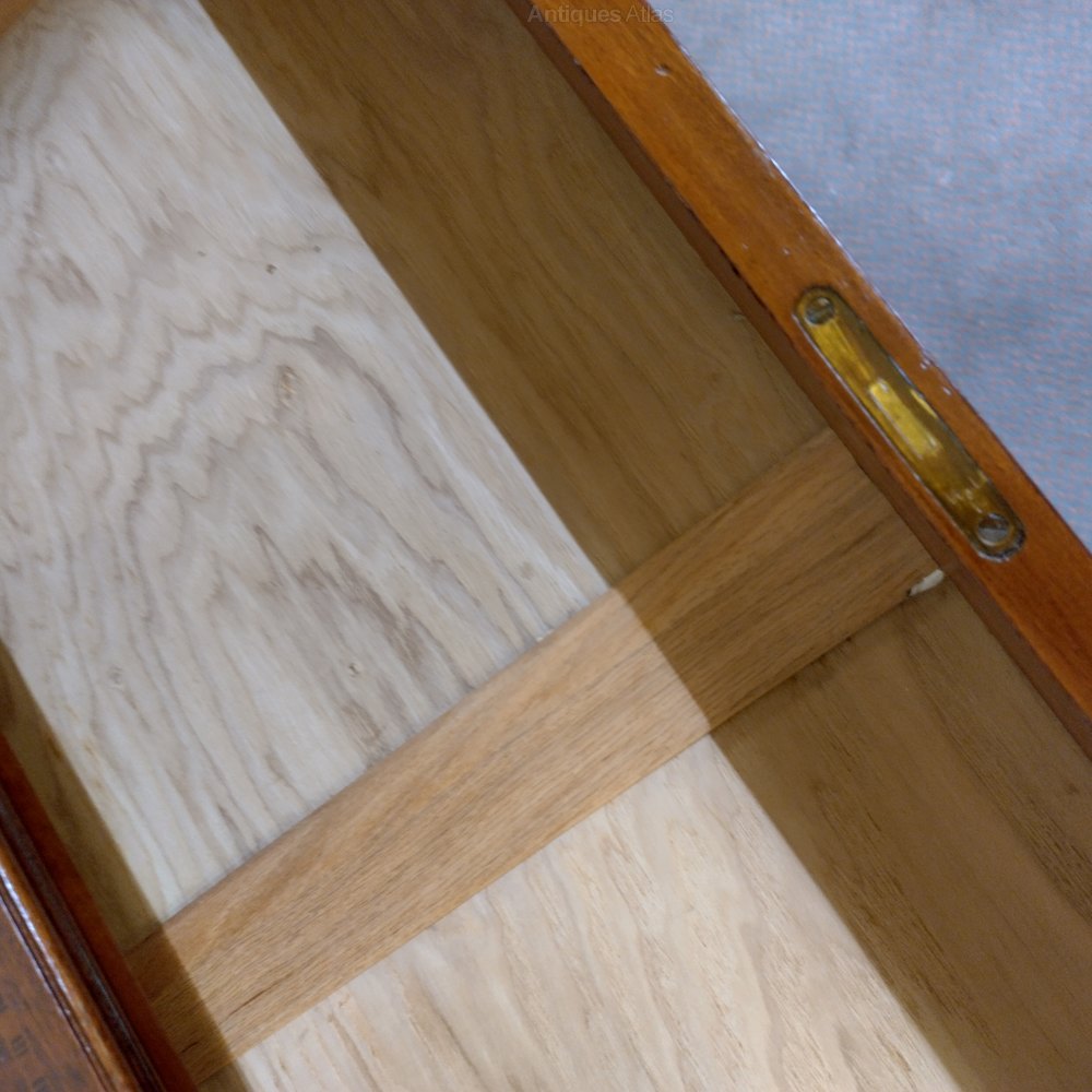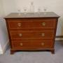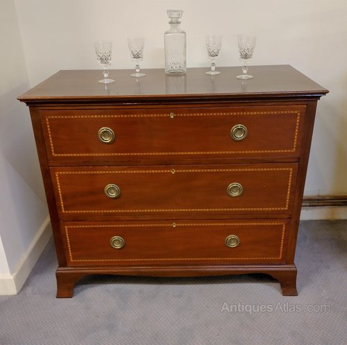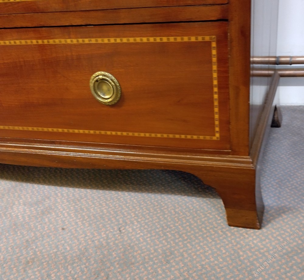 In lovely clean condition this inlaid chest of drawers from the early 1900s will certainly not disappoint. The plate handles appear original and the neat inlays are all crisp and in place. Colour is good as is the finish which is excellent. The inside is really clean and most useable as one of the pictures shows. A good looking most useable chest of drawers sitting on shaped bracket feet, all at a sensibleprice too.We have been in business for 40 years and are now coming up to retirement. We are in consequence looking to reduce our stock, Delivery can be arranged with a specialist carrier for around £70 to most areas. We now open by appointment, but we are often open Fridays and Saturdays, but cannot guarantee,( our sign will be out if passing ) it is worth ringing before coming.Tel 01565 874075