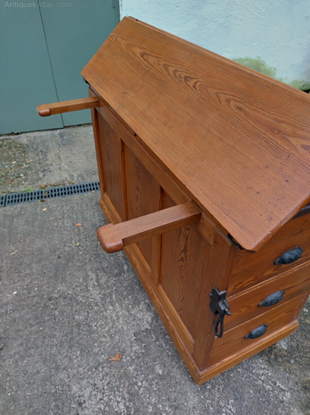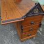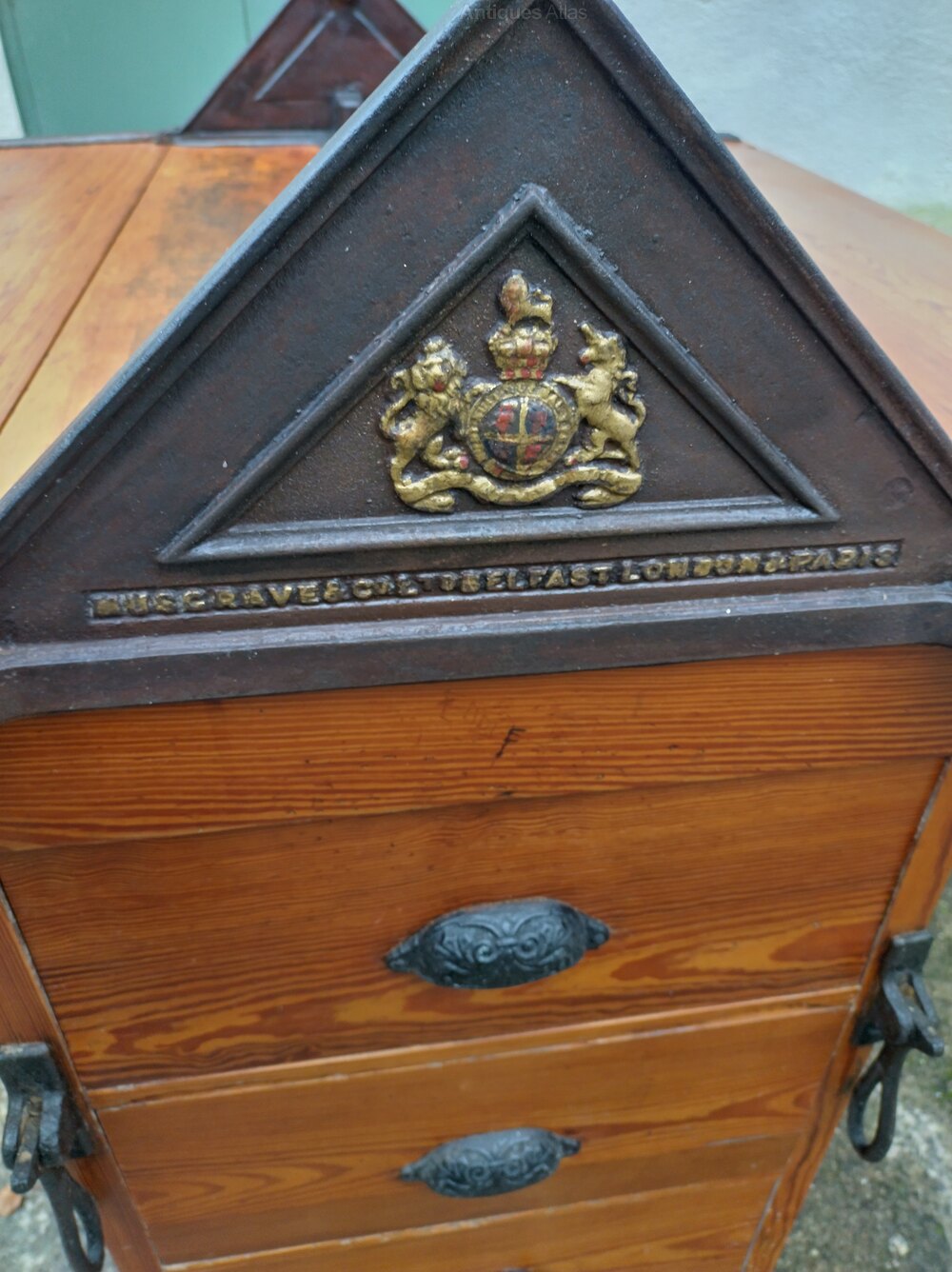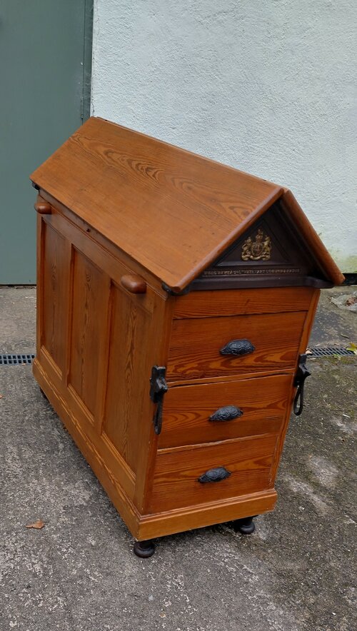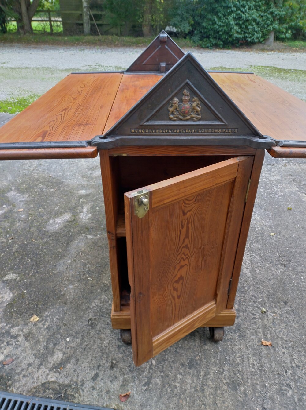 A rare find indeed, this saddle rack was made by Musgrave and Co in the second half of the 1900s, presented in well grained pitch pine. Having representation in London and Paris as well as the base in Belfast the company became synonymous with quality saddle racks. This example has just come out of our workshops having had a couple of minor repairs and a good clean, ensuring the impressive graining is kept intact as sanding can seriously detract from the look. The handles on the drawers are original and show the detail of the casting. The feet and castors are in place but the time sitting in tack rooms has stopped the castors rolling. The lifting handles are in place and the cast triangular ends are lovely with the highlighted detail in the casting. The top folds down to allow for cleaning of tack and other than some staining in the centre the surface is good with not too much marking over the last 150 years. The oposite end to the drawers there is a cupboard which still retains the brass locking catch. A lovely rare item, totally useable and would make a fantastic present for a person who is into horses, be this a present for oneself or for someone else. This givesspace to work on tack and with the drawers and cupboard space to store items too. Give us a call 01565 874075We have been in business for 40 years and are now coming up to retirement. We are in consequence looking to reduce our stock, Delivery can be arranged with a specialist carrier for around £70 to most areas. We now open by appointment, but we are often open Fridays and Saturdays, but cannot guarantee,( our sign will be out if passing ) it is worth ringing before coming.Tel 01565 874075