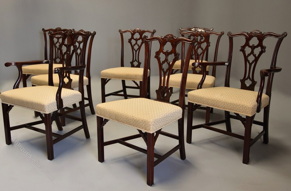 A set of eight late 19th century (circa 1900) Chippendale style mahogany dining chairs comprising of two armchairs and six single chairs.The chairs consist of a shaped and carved top rail with carving to the ears with carved decoration to the centre with moulded uprights and a pierced and carved central splat, the armchairs having shaped and moulded arms.