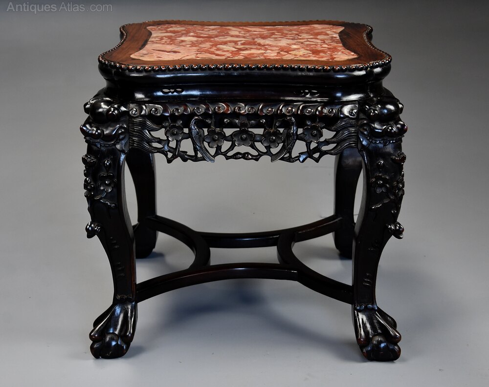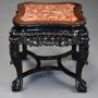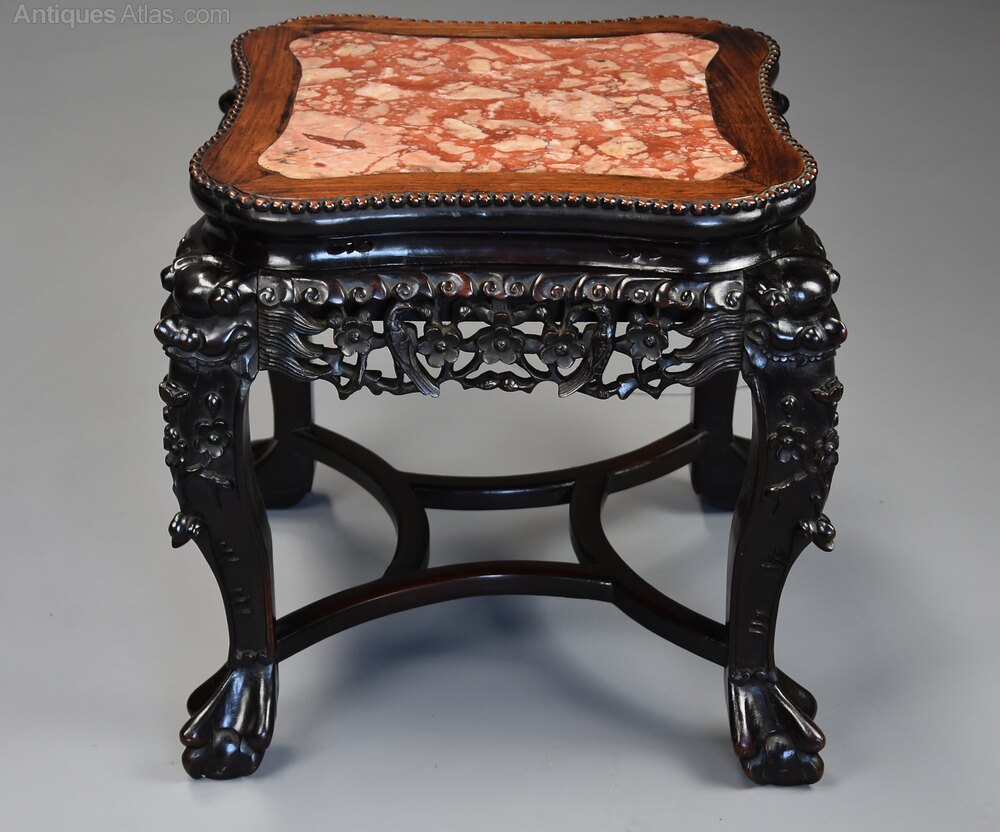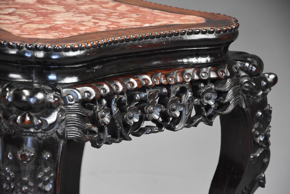 A late 19th century Chinese hardwood pot stand or low table with shaped marble inset top.This pot stand consists of a shaped Chinese pink marble top, this recessed into a hardwood top with carved ball decoration to the outer edge.