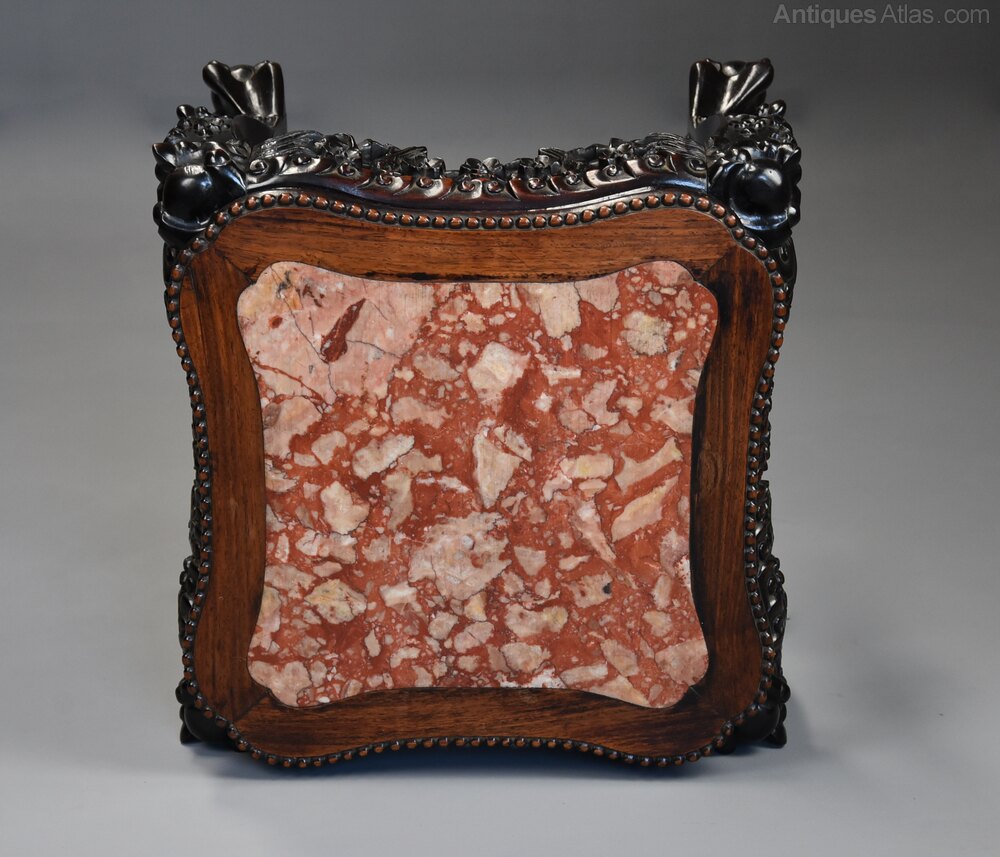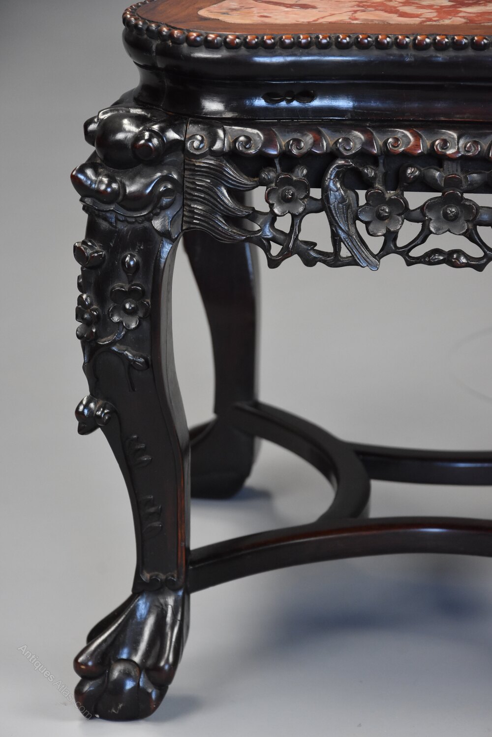 The stand is supported by four cabriole legs, the top of the legs having a carved dragon face with carved floral decoration to the knee leading down to ball and claw feet, the legs joined with a shaped stretcher.
