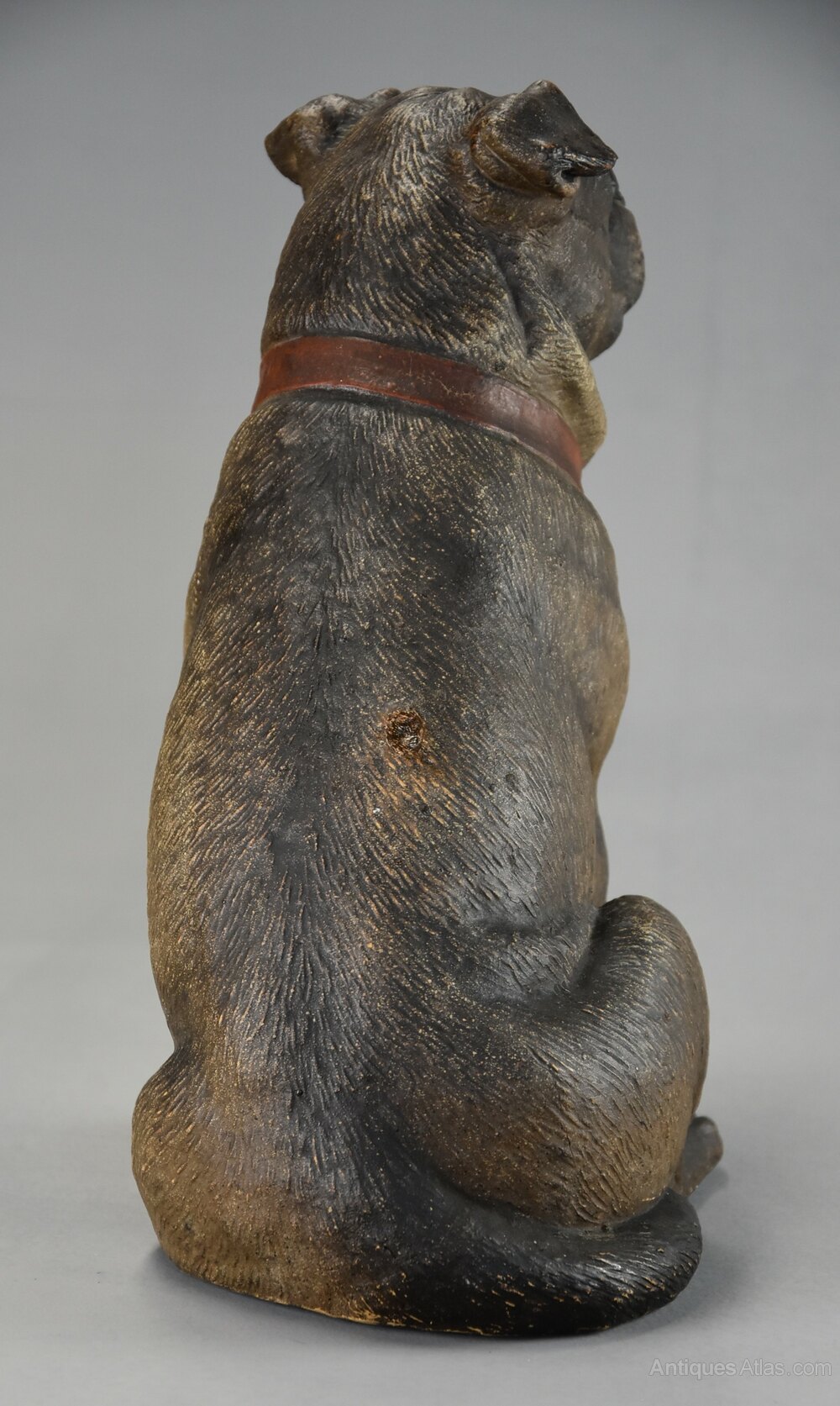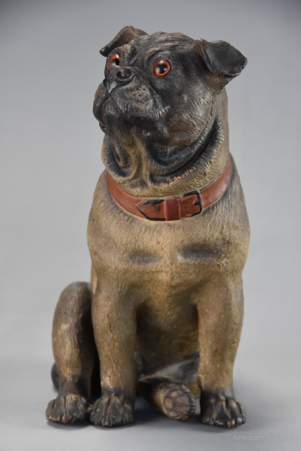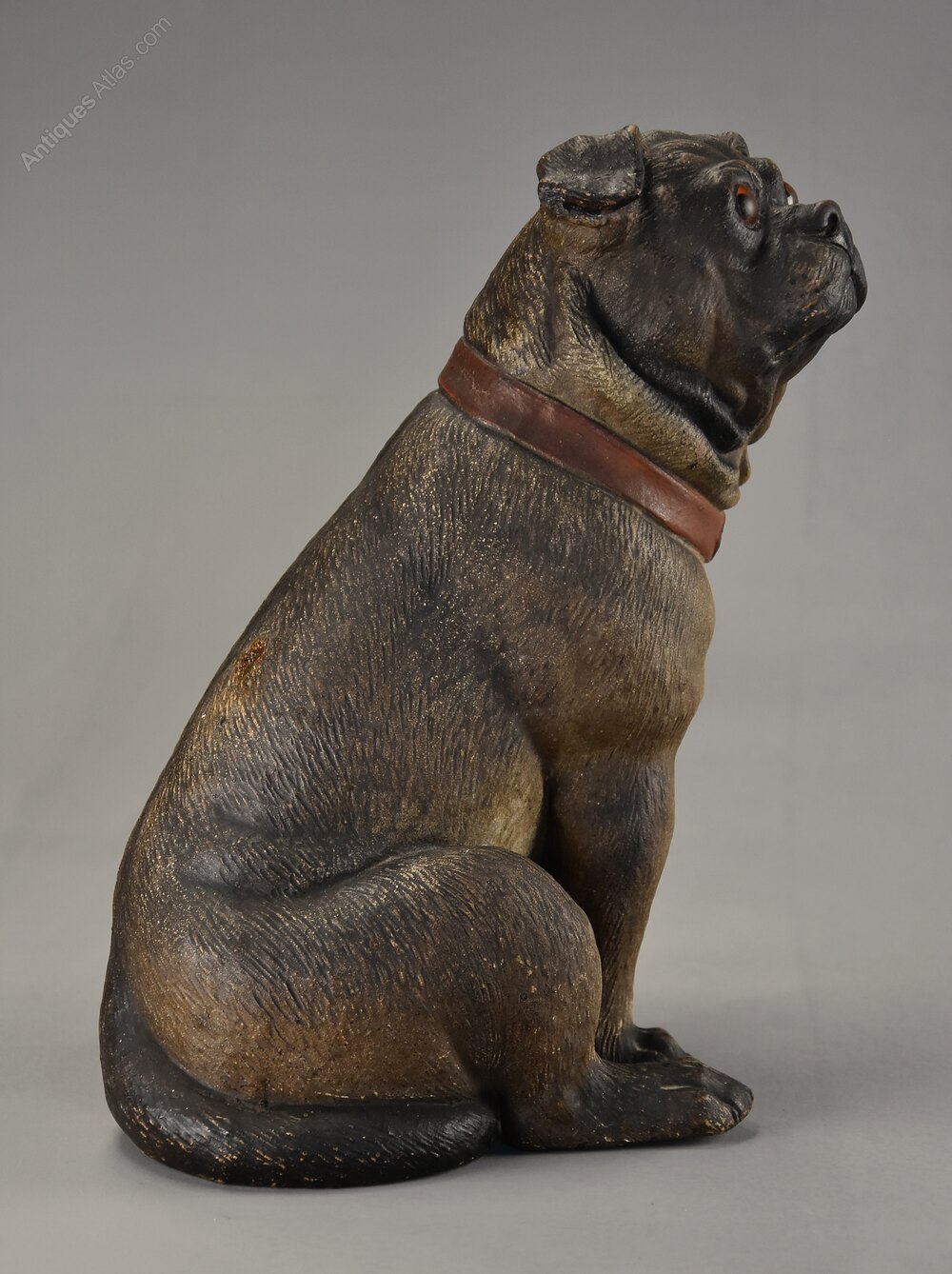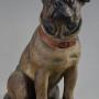 A charming late 19th century (circa 1880) Austrian handcrafted and hand painted terracotta Pug dog with collar in a seated position.This charming Pug is depicted seated wearing a collar, also having his original glass eyes.