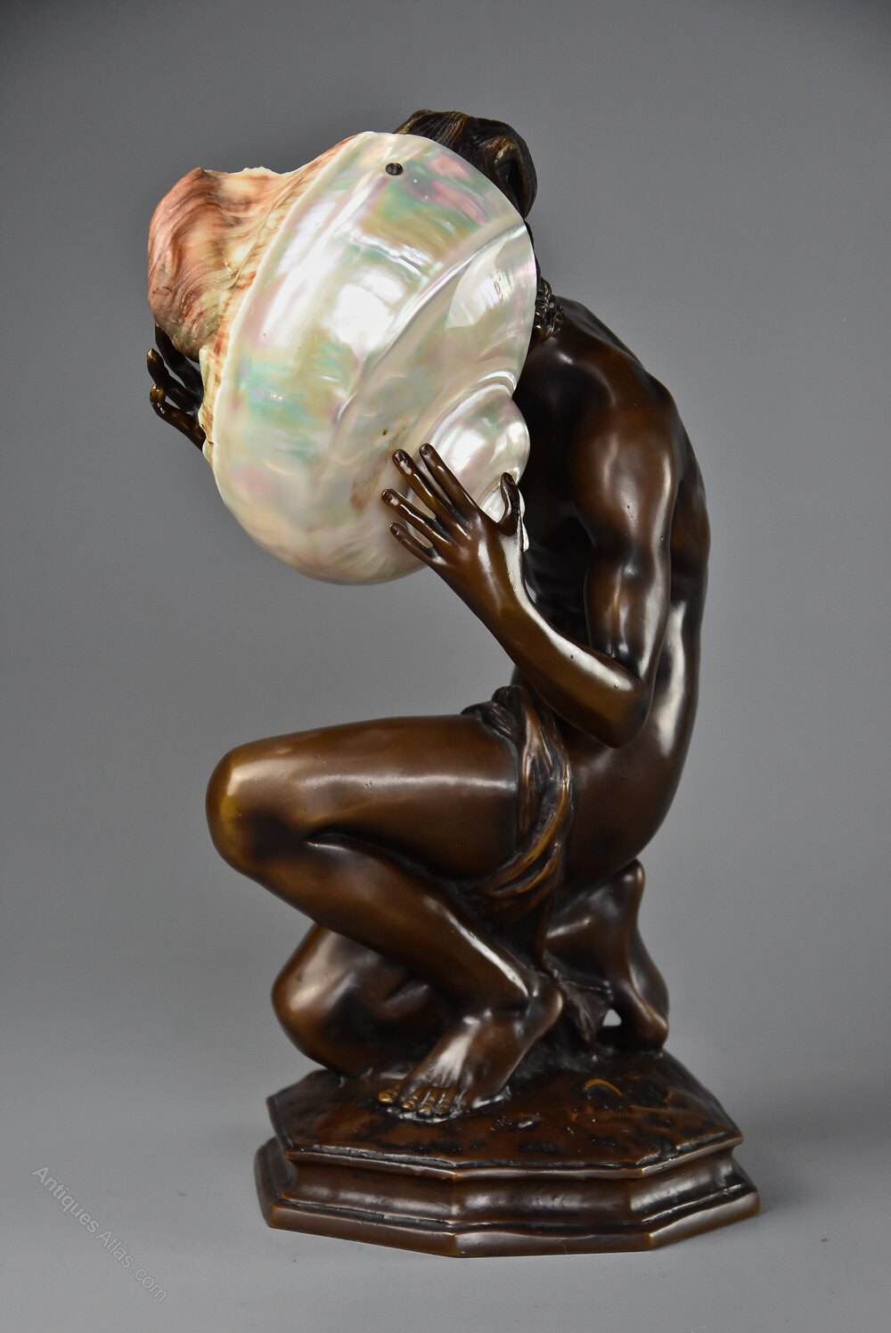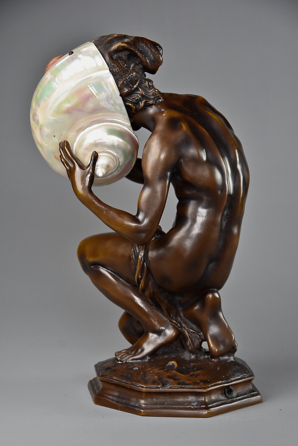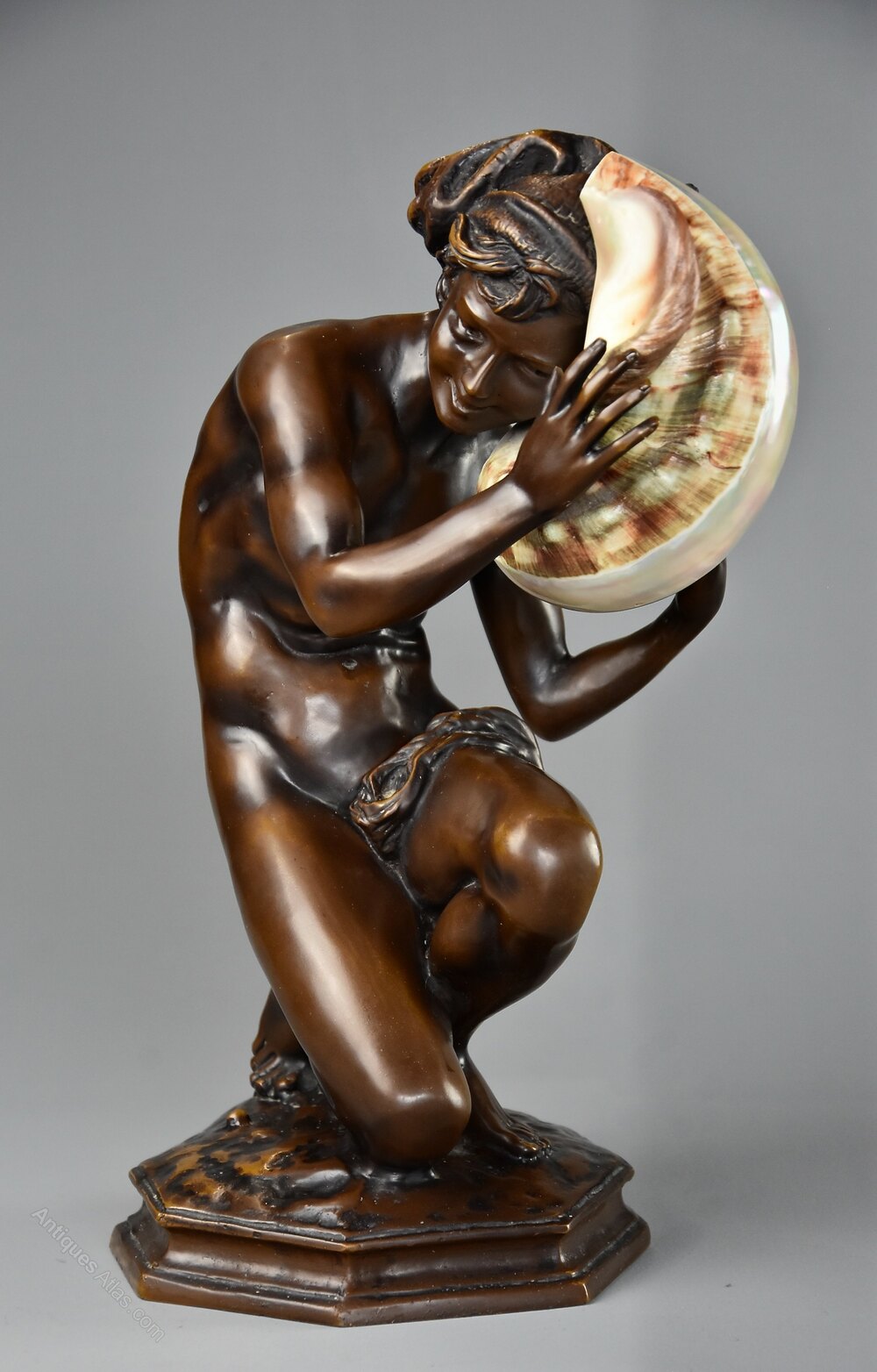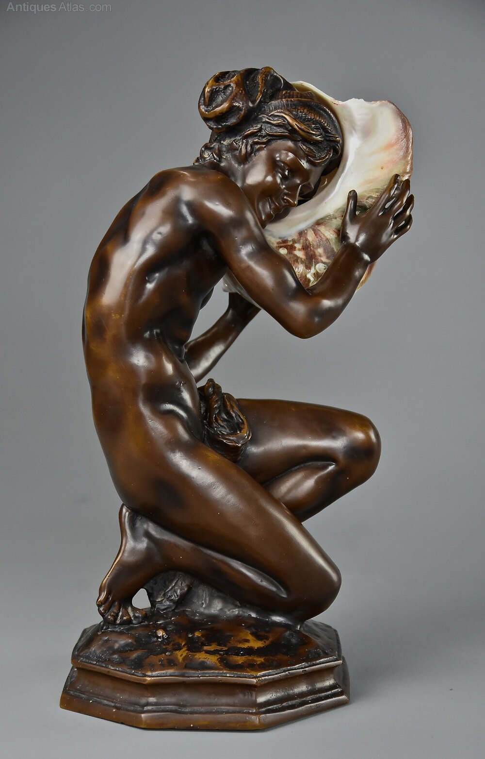 An early 20th century French bronze figure of the ‘Neapolitan Fisherboy', after Jean-Baptiste Carpeaux (1827 - 1875).This decorative bronze depicts the Neapolitan Fisherboy holding a shell to is ear with fishing net draped over his left leg in crouching pose on naturalistic octagonal base.