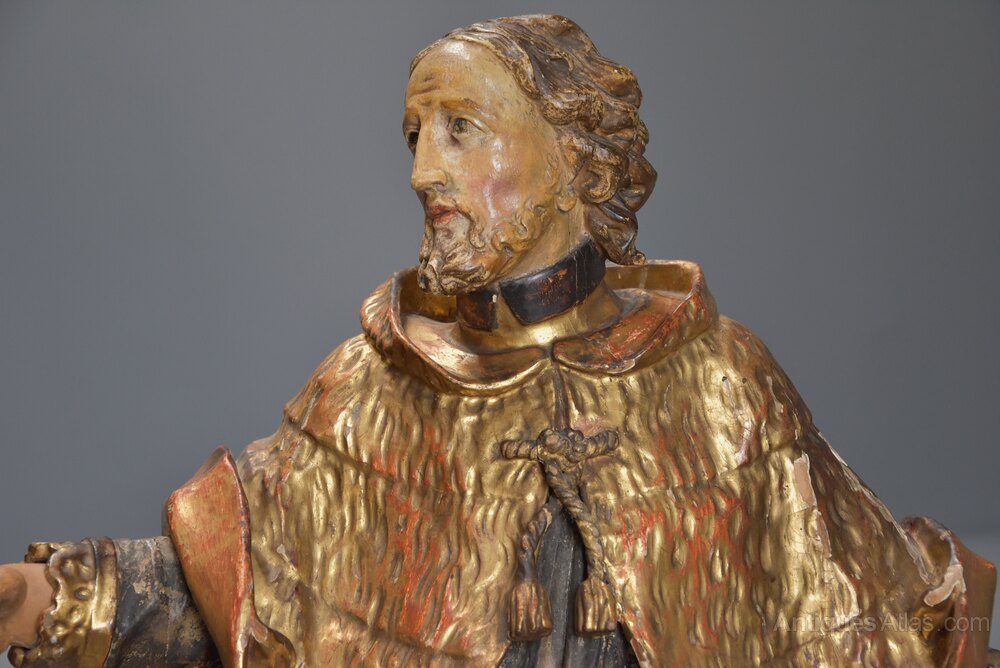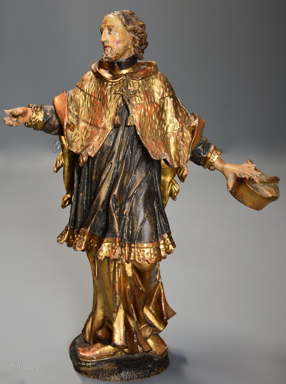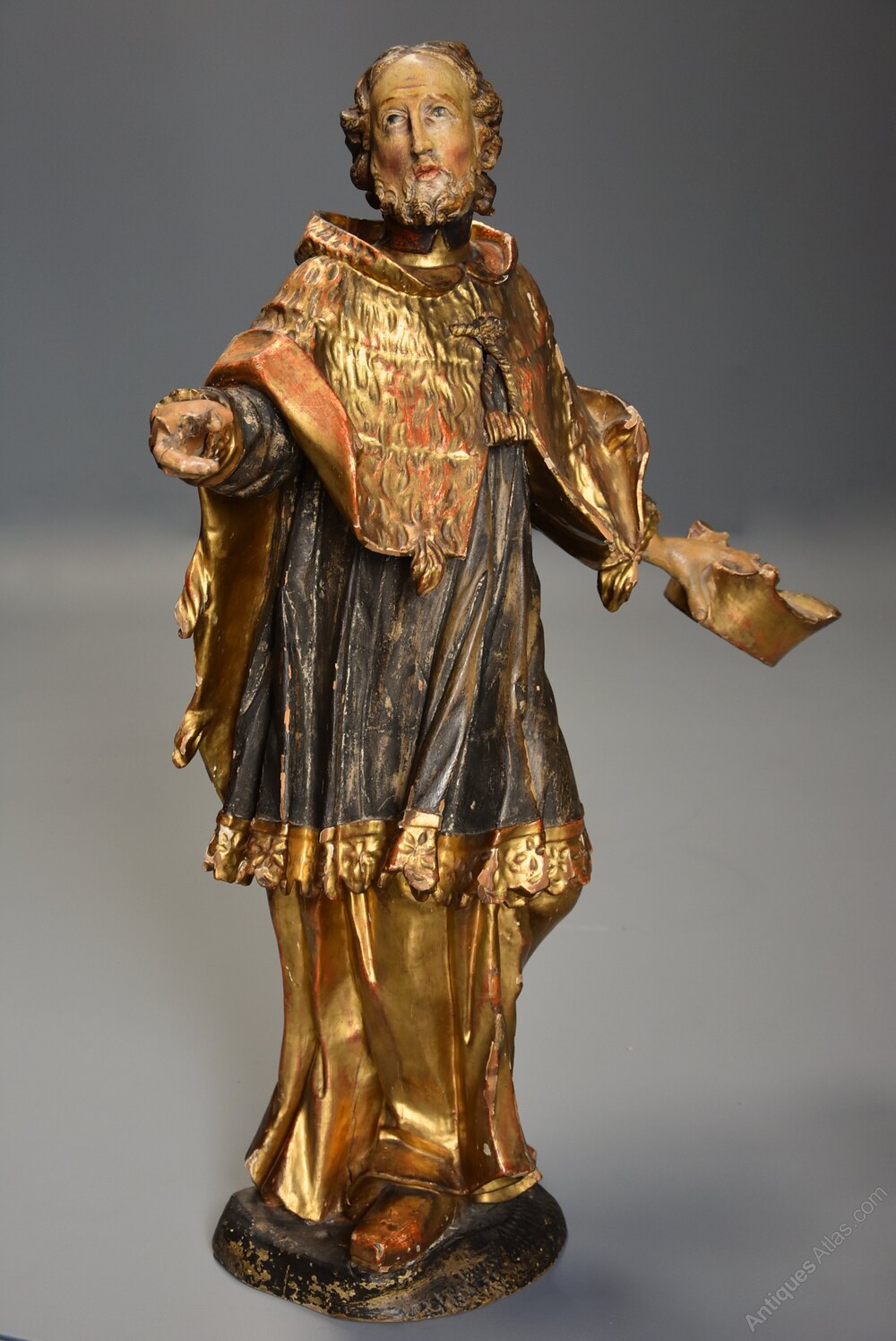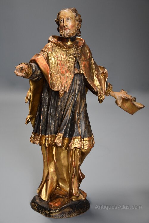 A superbly carved and highly decorative mid 18th century (circa 1760) Continental polychrome and gilt figure, probably of Saint John of Nepomuk.This carved figure depicts St John of Nepomuk standing in his gold and blue robes with textured gold cloak holding a biretta (religious hat).