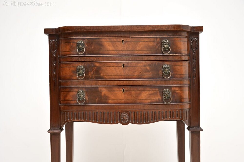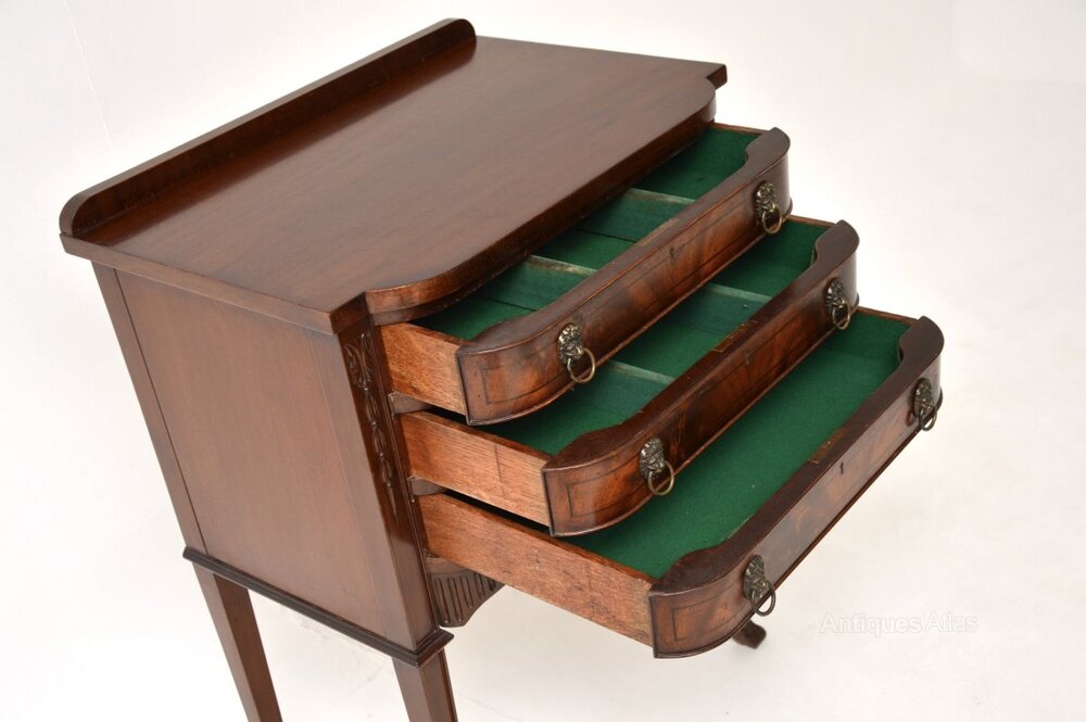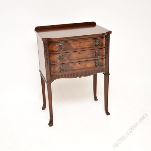 A beautifully designed antique Sheraton style mahogany side / server table. This was made in England, it dates from around the 1930’s.It is of fantastic quality and is a useful compact size. There are three felt lined drawers with brass lions head ring pull handles. There is lovely carving on the edges and down at the bottom of the feet.