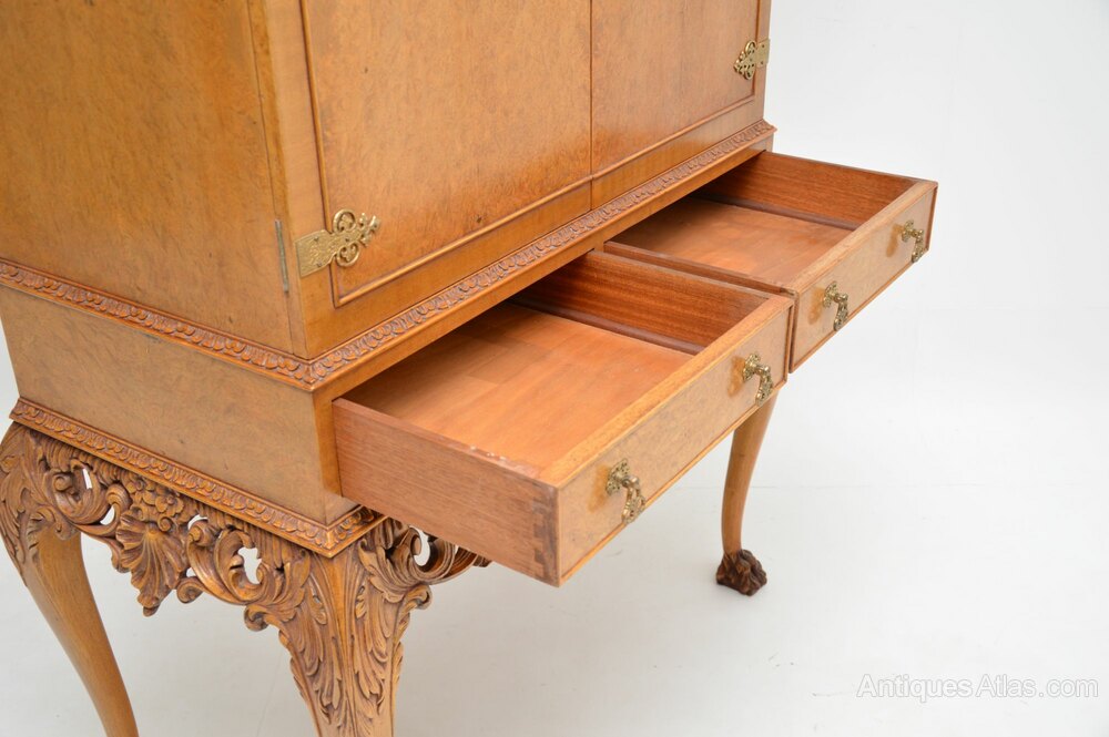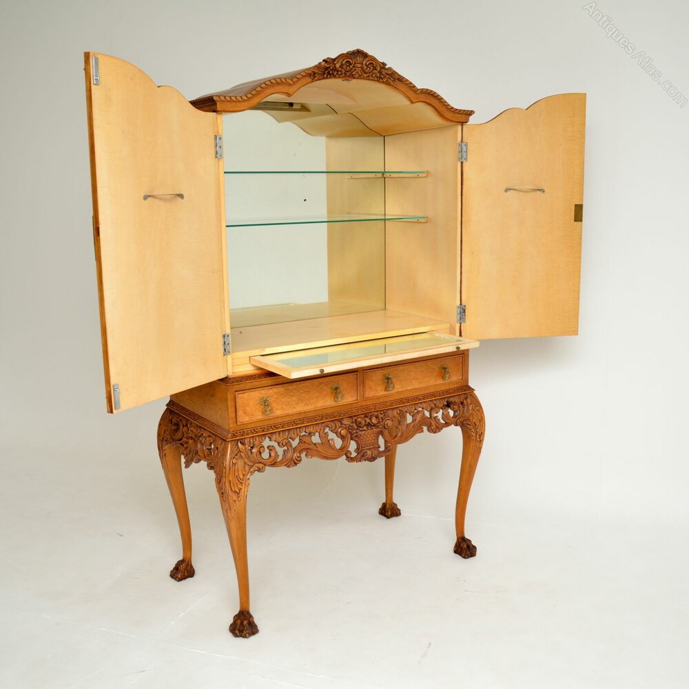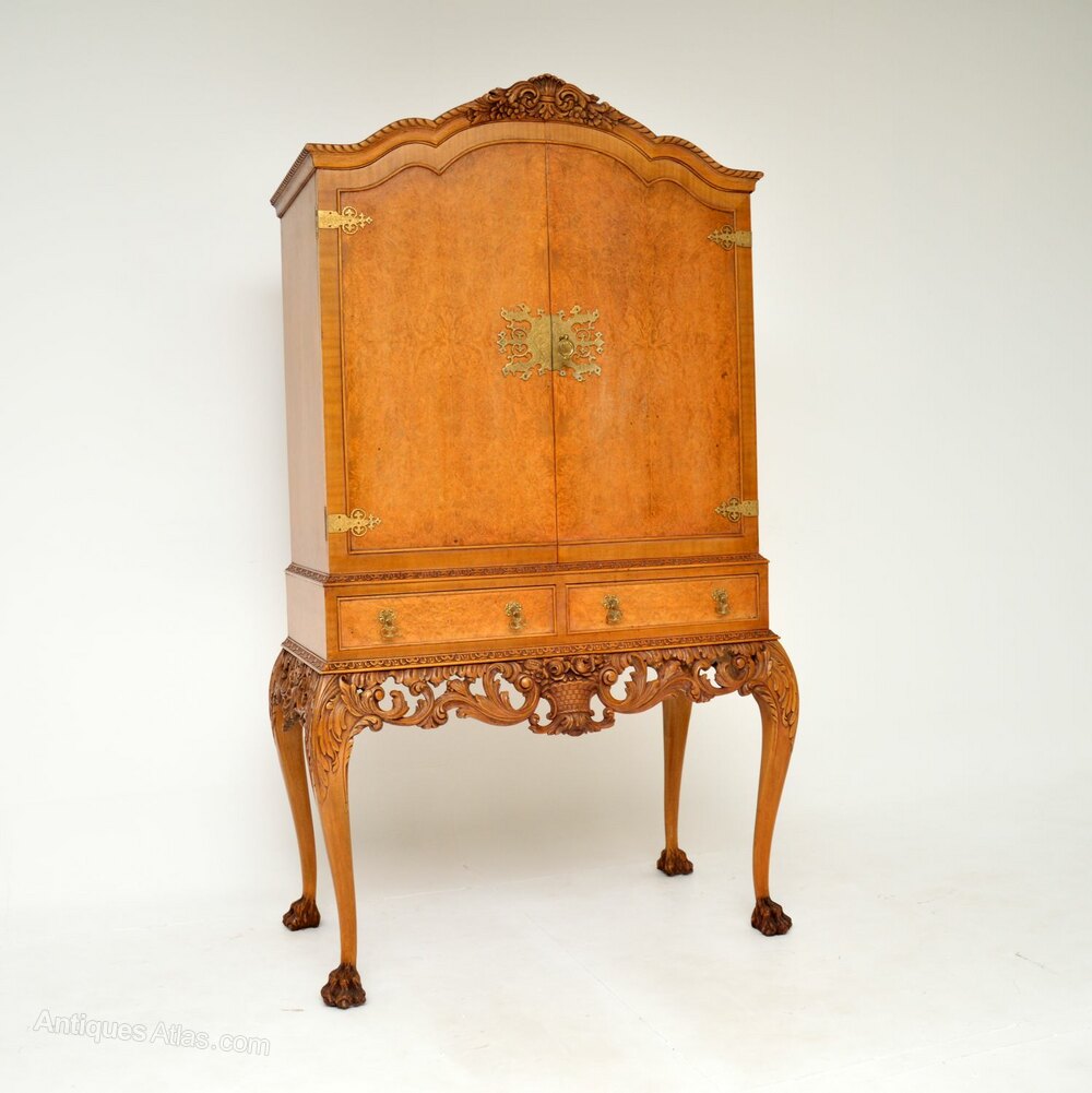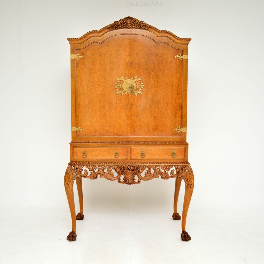 An exceptional antique burr walnut Queen Anne style cocktail drinks cabinet. This was made in England, it dates from around the 1920-30’s.It is of amazing quality with some extremely beautiful and useful features.
