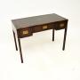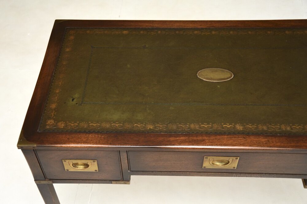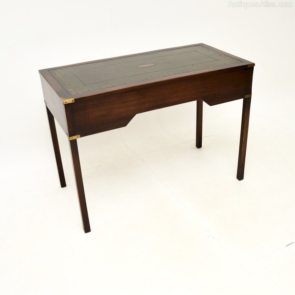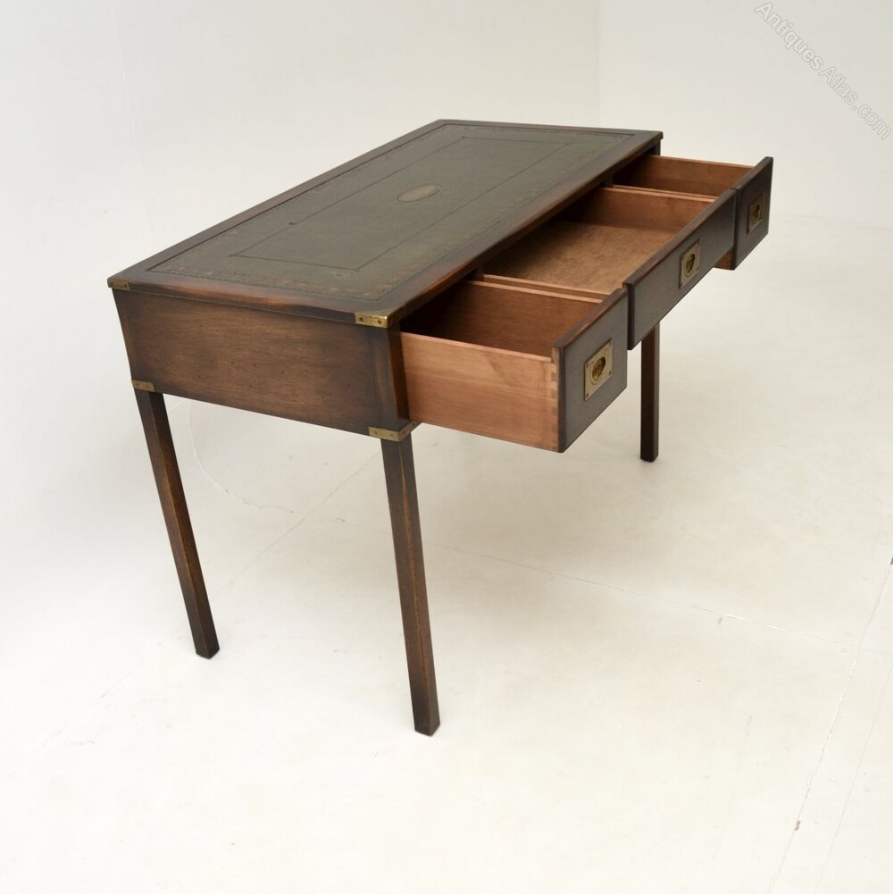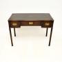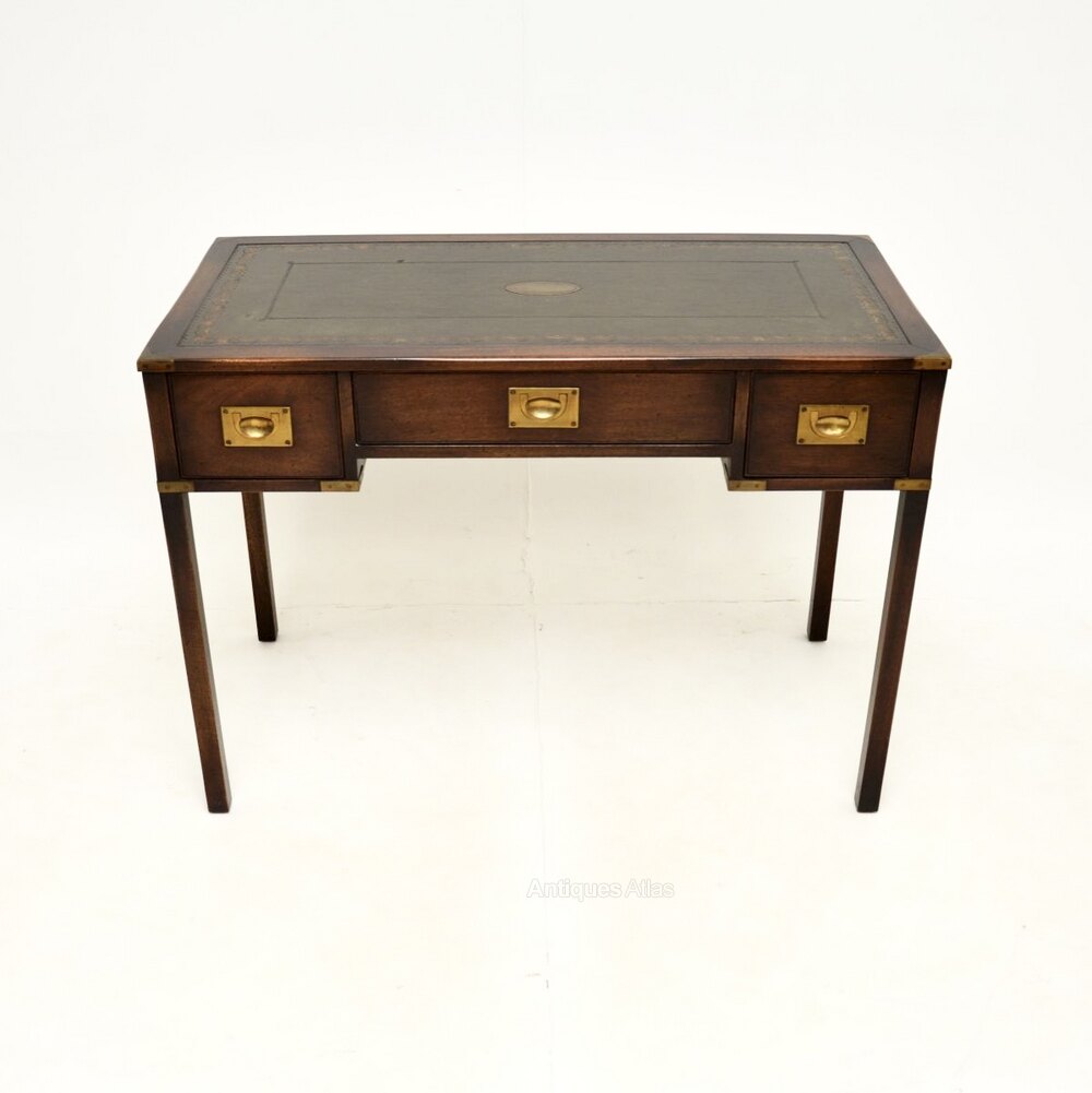A wonderful antique mahogany military campaign desk / writing table. This was made in England, it dates from around the 1930’s.It is very well made and has a very smart design. The mahogany is offset beautifully by the brass details. There is an inset tooled leather top which has gold tooling around the edges and has a small inset brass plate in the centre. This is a very useful size, and is finished nicely on the back as well, so it can be used as a free standing item.