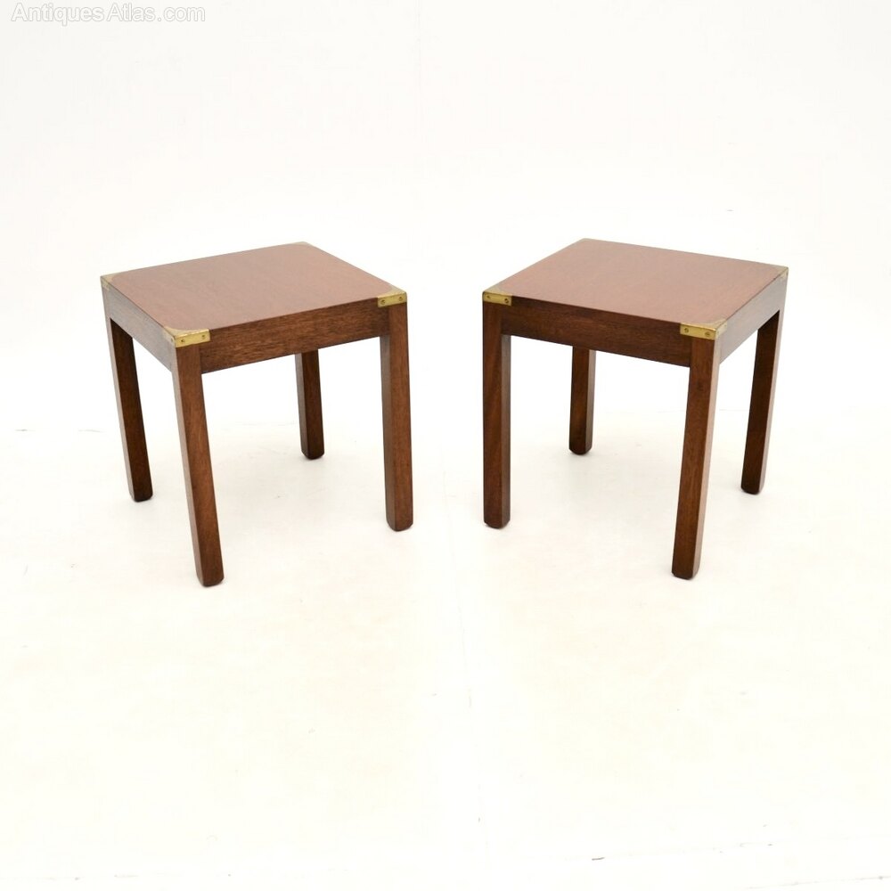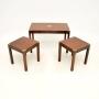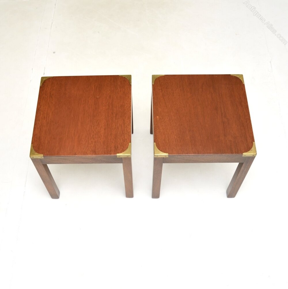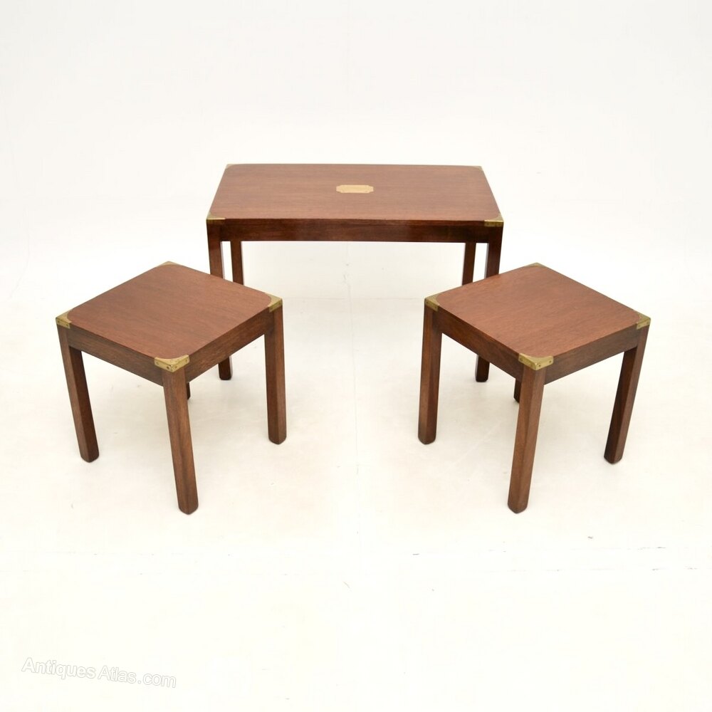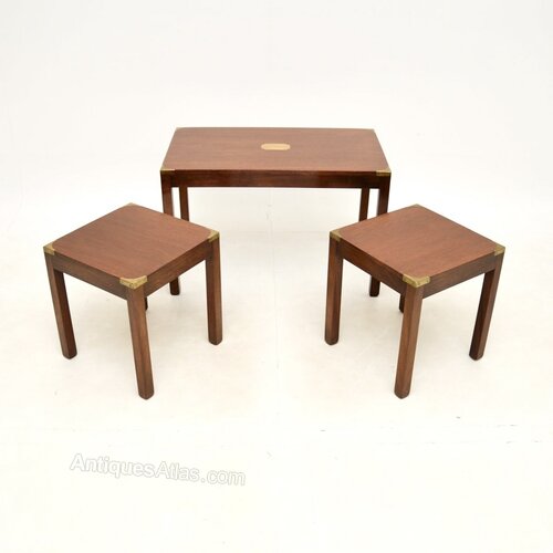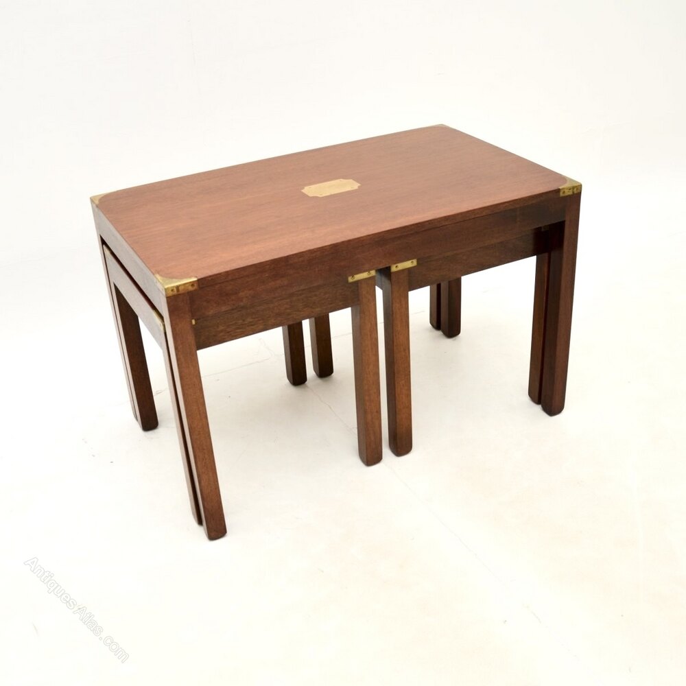 A wonderful antique mahogany military campaign nesting coffee table / side tables. These were made in England, they date from around the 1930’s.They are of excellent quality and have a very useful design. The two smaller side tables nest under the larger coffee table when not in use, and are designed to be used separately as side tables. The brass mounts are very well made and contrast beautifully against the rich mahogany.