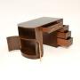 A stunning original Art Deco figured walnut leather top desk. This was made in England, it dates from the 1930’s.It has an unusual and stylish design, with a nice and compact size, the quality is absolutely amazing. One side is curved with open shelving and a two door cabinet on the side, there is an inset black leather writing surface. The other side has a bank of drawers with finely sculpted satin wood handles. The top drawer is a dummy drawer, and the top lifts up to reveal a divided pigeon hole compartment. The solid wood construction has beautiful figured Australian walnut veneers, giving a striking effect. This is also beautifully polished on the back, so can be used as a free standing item.