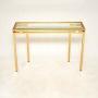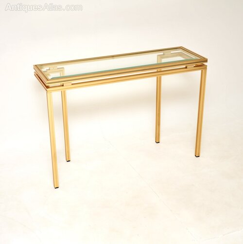 A stylish and very well made vintage French console table by Pierre Vandel. This was made in Paris, it dates from the 1970’s.The design is beautiful and practical, the frame is made from brushed brass tone aluminium, it has a slender and chic design. The console has a clear glass top with bevelled edges.