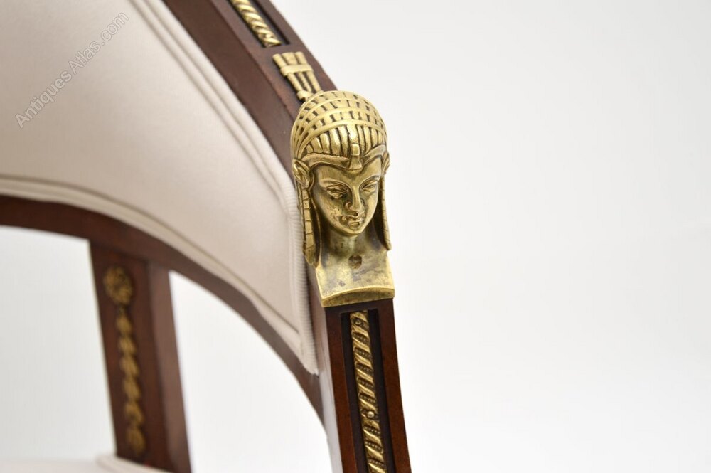 An impressive and beautifully designed pair of antique Swedish neoclassical mahogany armchairs. They are in the Gustavian style, they were recently imported from Sweden and date from around the 1900-1910 period.The quality is outstanding, and they are of lovely proportions. The solid mahogany frames are beautifully curved, they have very high quality ormolu mounts wih Egyptian inspired heads on the arm rests.