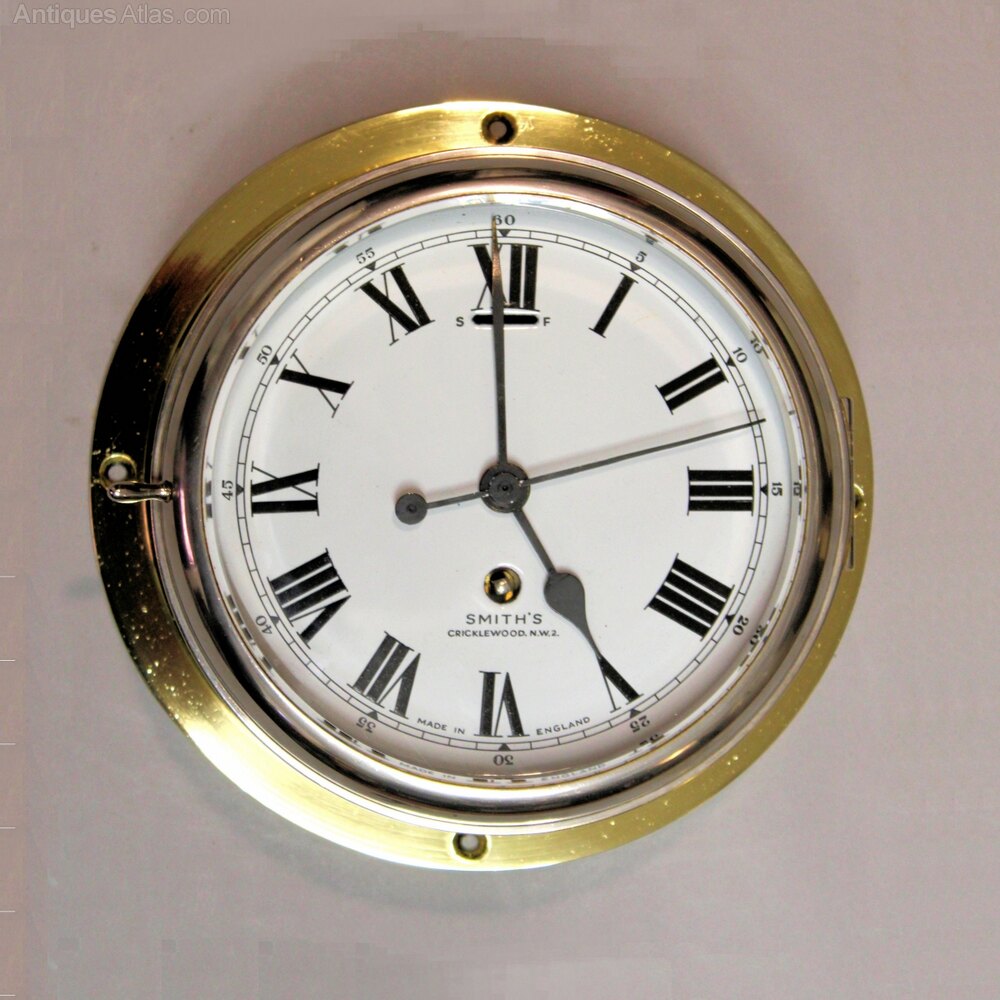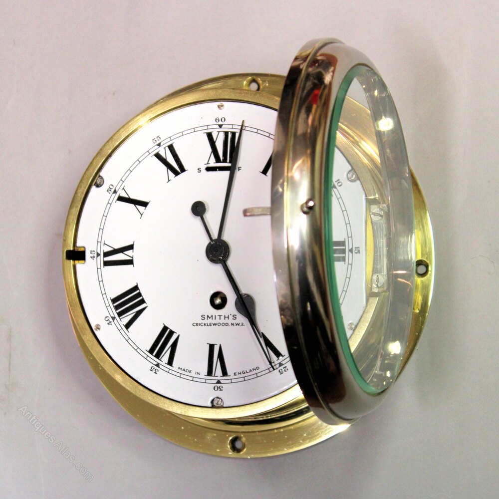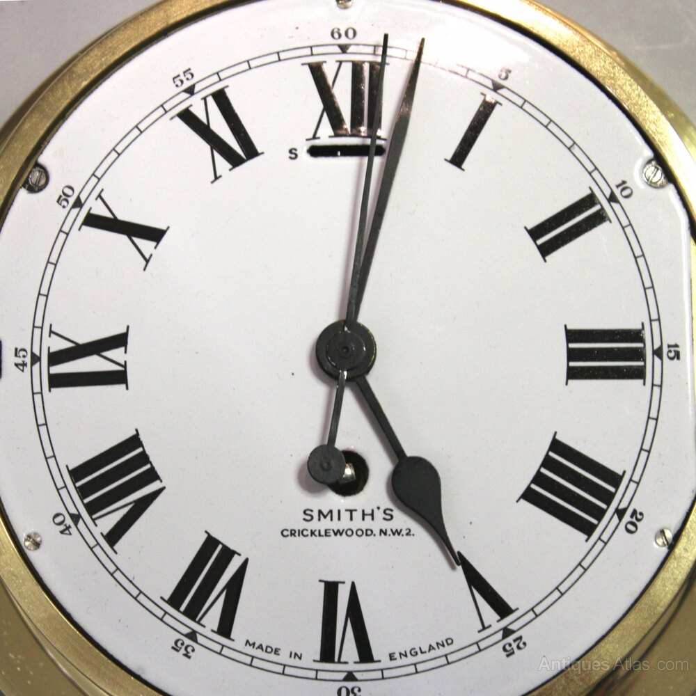 A very susbstantial 'ship's' clock in original condition with enamel dial and brass case.The superior quality, 8 day duration movement with its original jewelled, lever platform escapement and having an extended arbour to carry the centre sweep, seconds hand. It has a powerful mainspring and is fixed to an iron 'false' dial that carries the 6 1/2" diameter, white vitreous enamel dial with black, small and outer, Arabic 5 minute numerals, a divided minute track with hour triangles and inner, Roman hour numerals. Below the figure XII is the aperture to regulate the escapement and below the winding hole is signed "SMITH'S CRICKLEWOOD N.W.2" also, "MADE IN ENGLAND". The hour hand is spade shaped and the centre seconds hand is counterpoised.