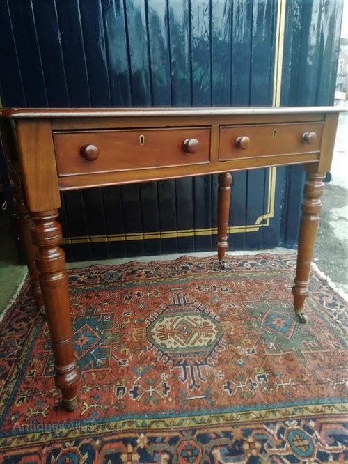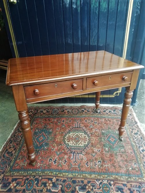 Nice quality English mahogany two drawer writing table/ side table, circa 1880, with polished mahogany top , two spacious drawers with turned button handles, and standing on four well turned supports with brass castors to each.Nicely proportioned antique table of a handy size which could lend itself to many functional uses in either the period or contemporary home.