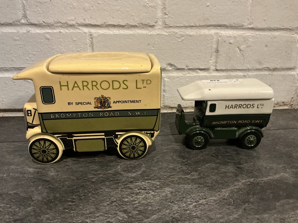 James Sadler and Sons Ltd vintage ceramic jar the form of a 1919Walker Electric Van , produced exclusively for Harrods . Height 13 cms. Accompanied by a more modern smaller version by London PotteryDate1980s