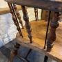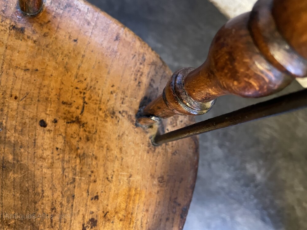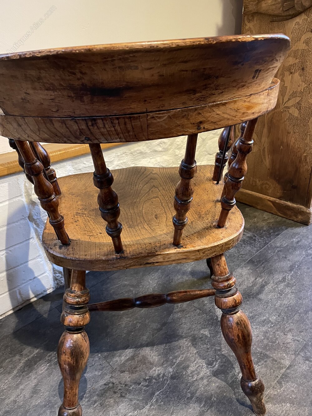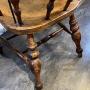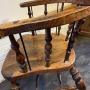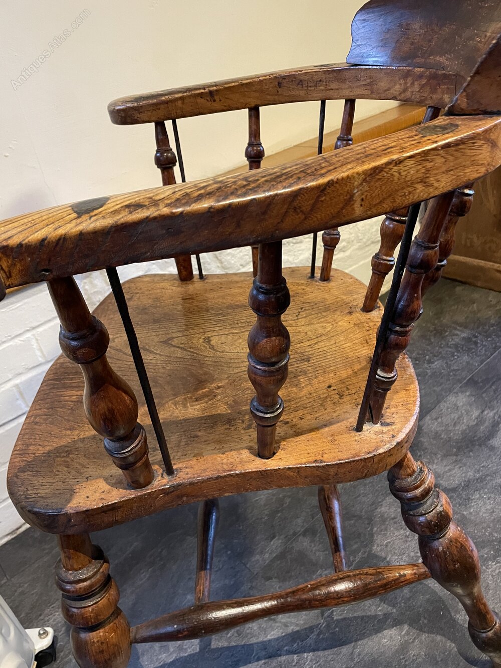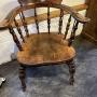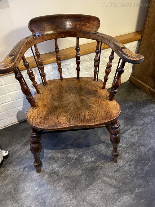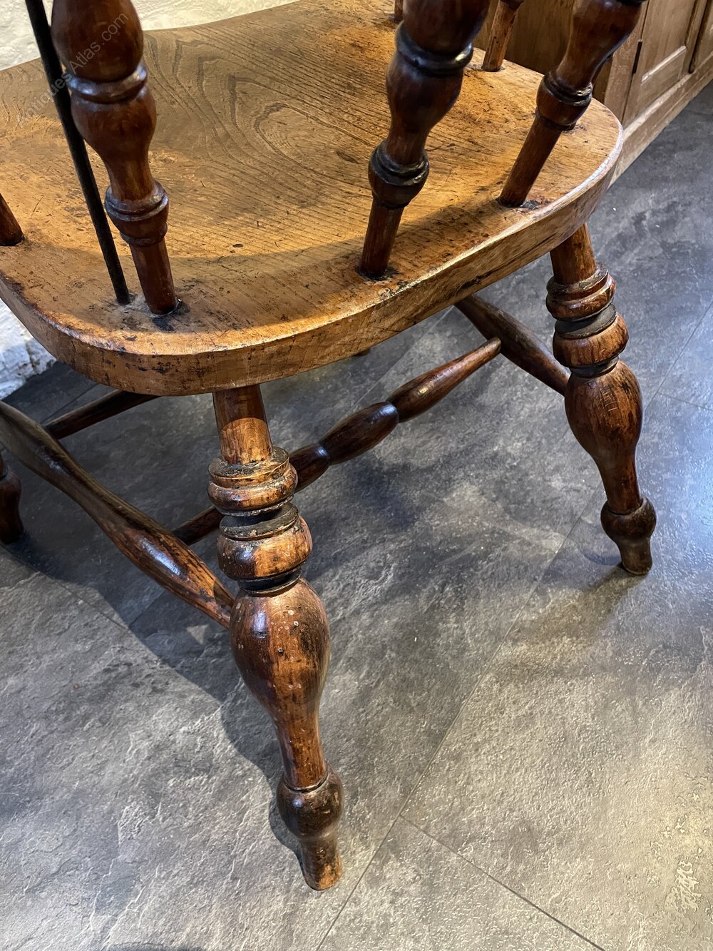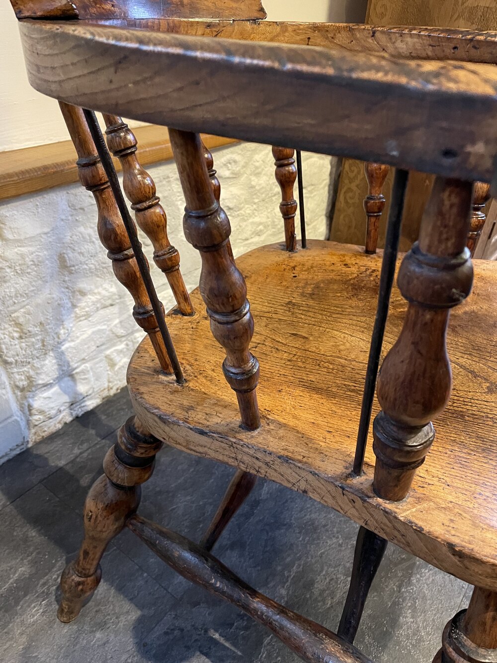 An ash and elm Captain’s or smoker’s bow backed chair with saddle seat .Well turned spindles and legs with double stretchers . Over the years it has had some interesting iron re-enforcing rods on the arms which really add to the character of the chair .There has been a repair to the base of one spindle at the rear of the chair as seen in photo.DateMid 19th Century