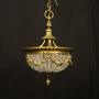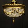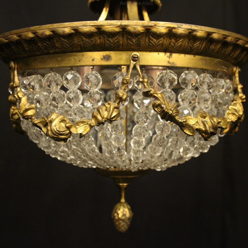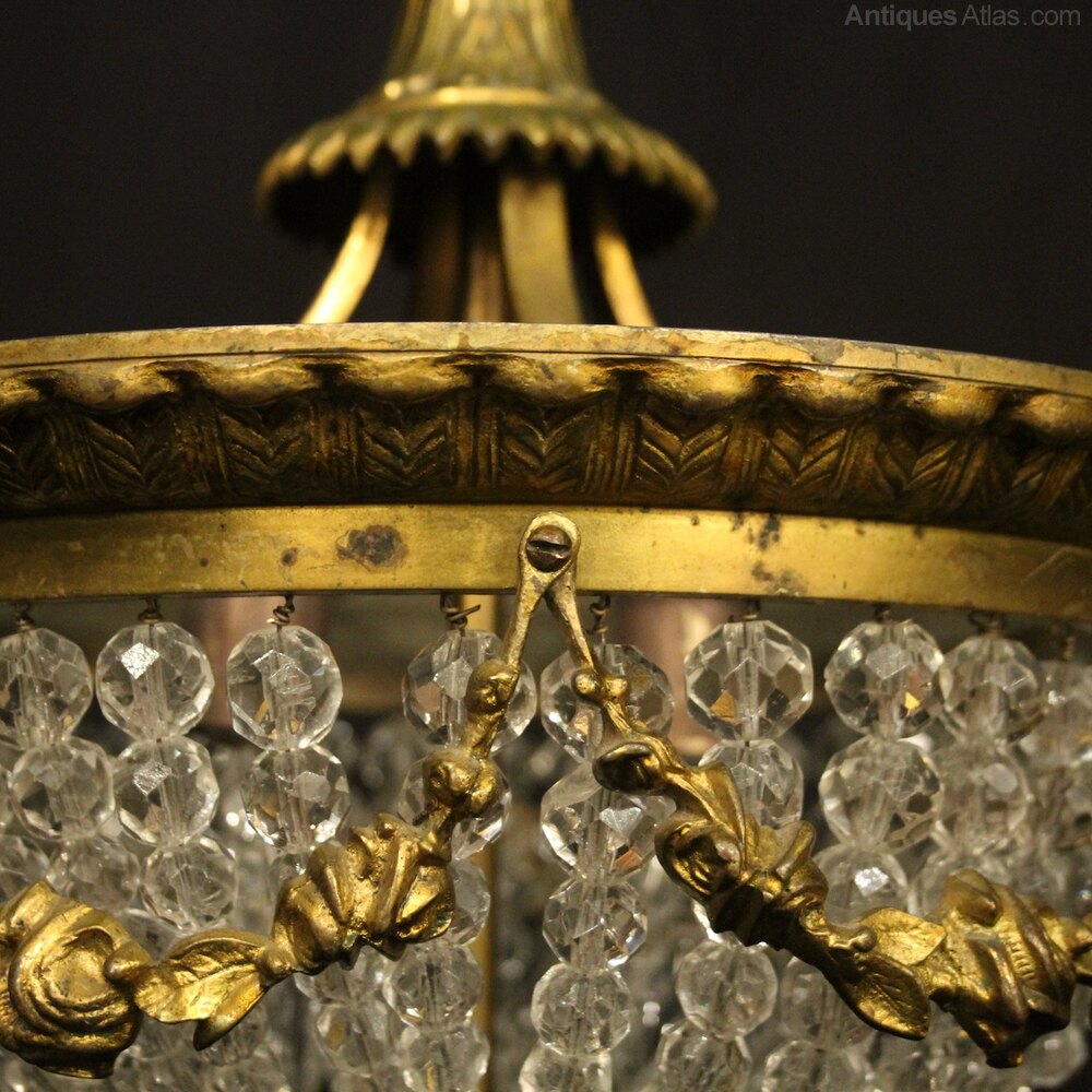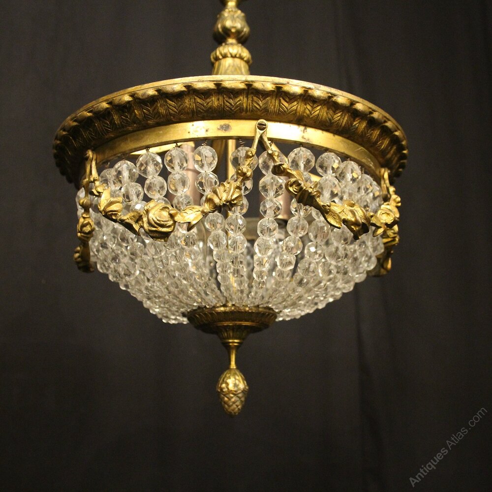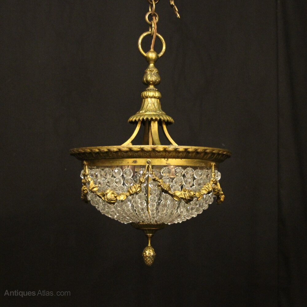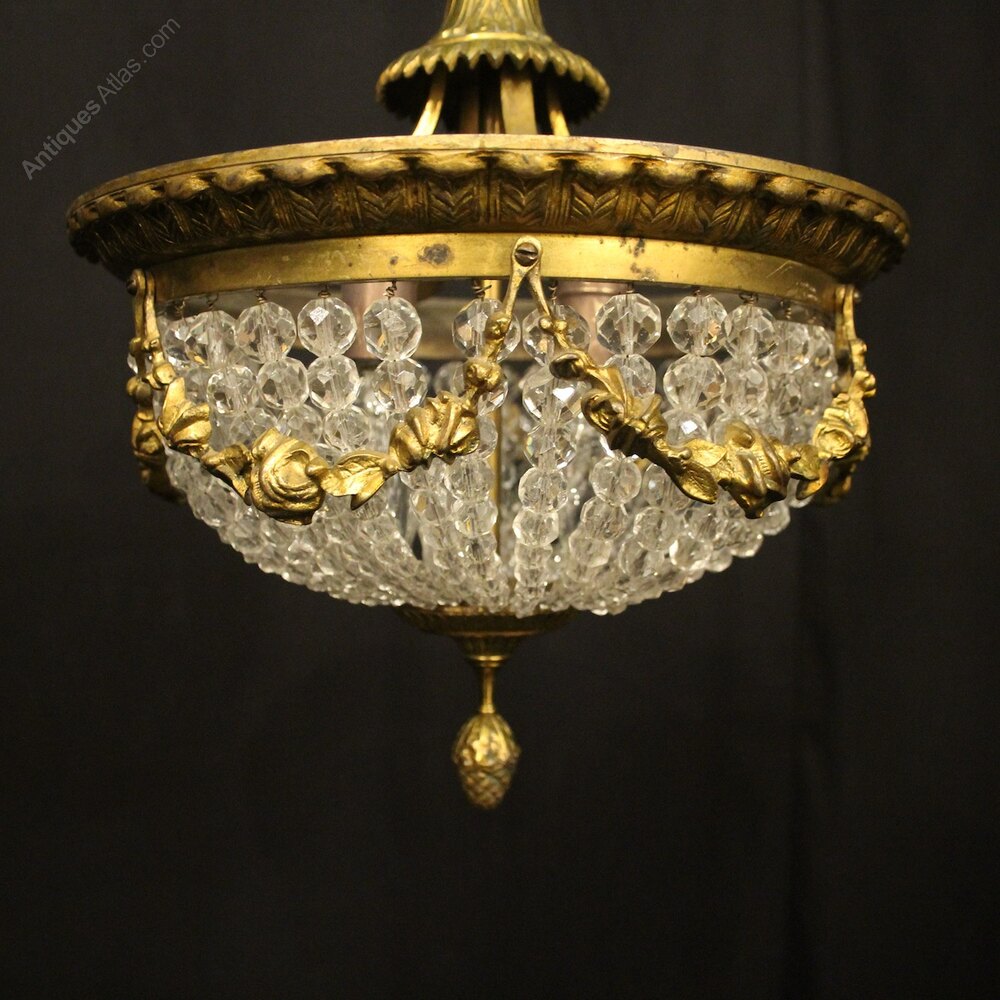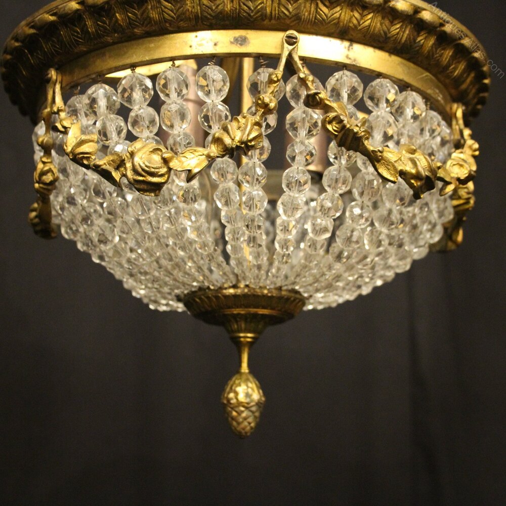A French gilded bronze and crystal twin light bag antique chandelier, the two inverted light fittings sitting inside a decorative leaf central band and scrolling canopy with ring final, decorated with graduated swaged crystal faceted pendants and having the original chain and ceiling rose, lovely quality light fitting and super small scale. Fully rewired and PAT tested. All our chandeliers come with bulbs and ceiling fixings.Dimensions: H: 18"/46cm W: 12"/31cm Excluding Chain & Rose