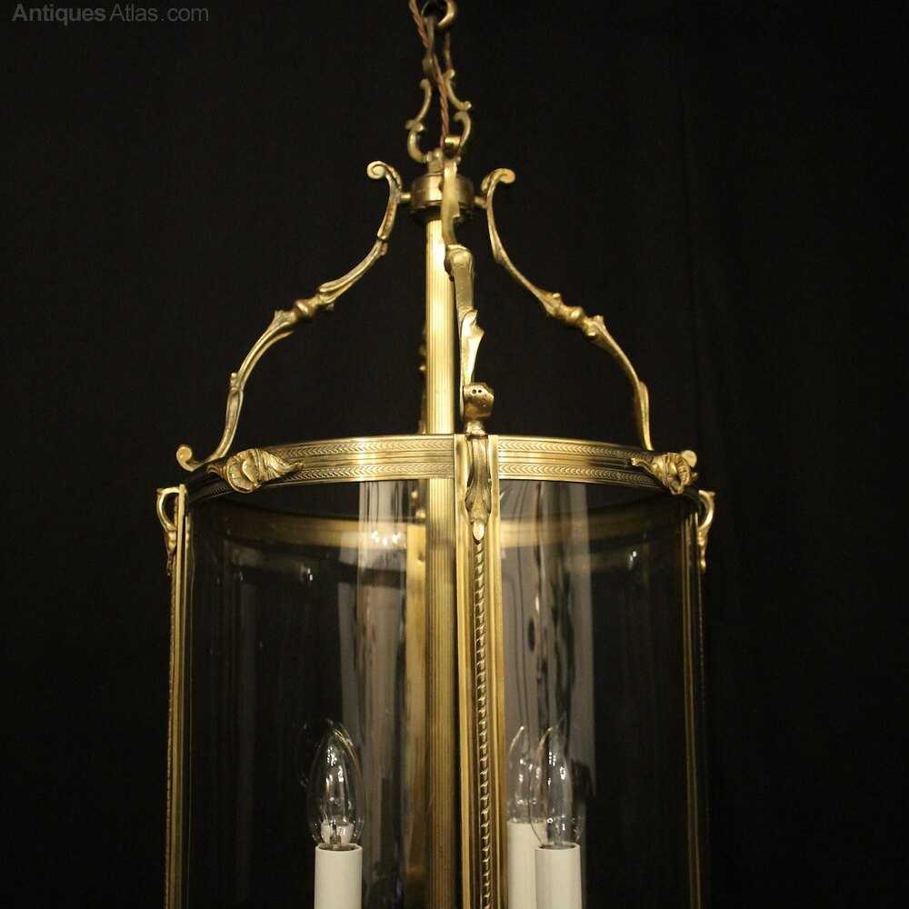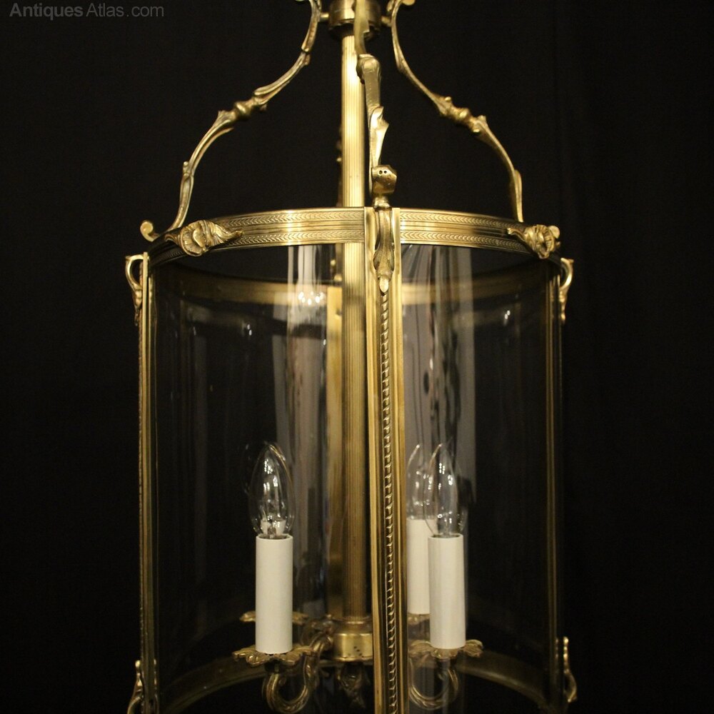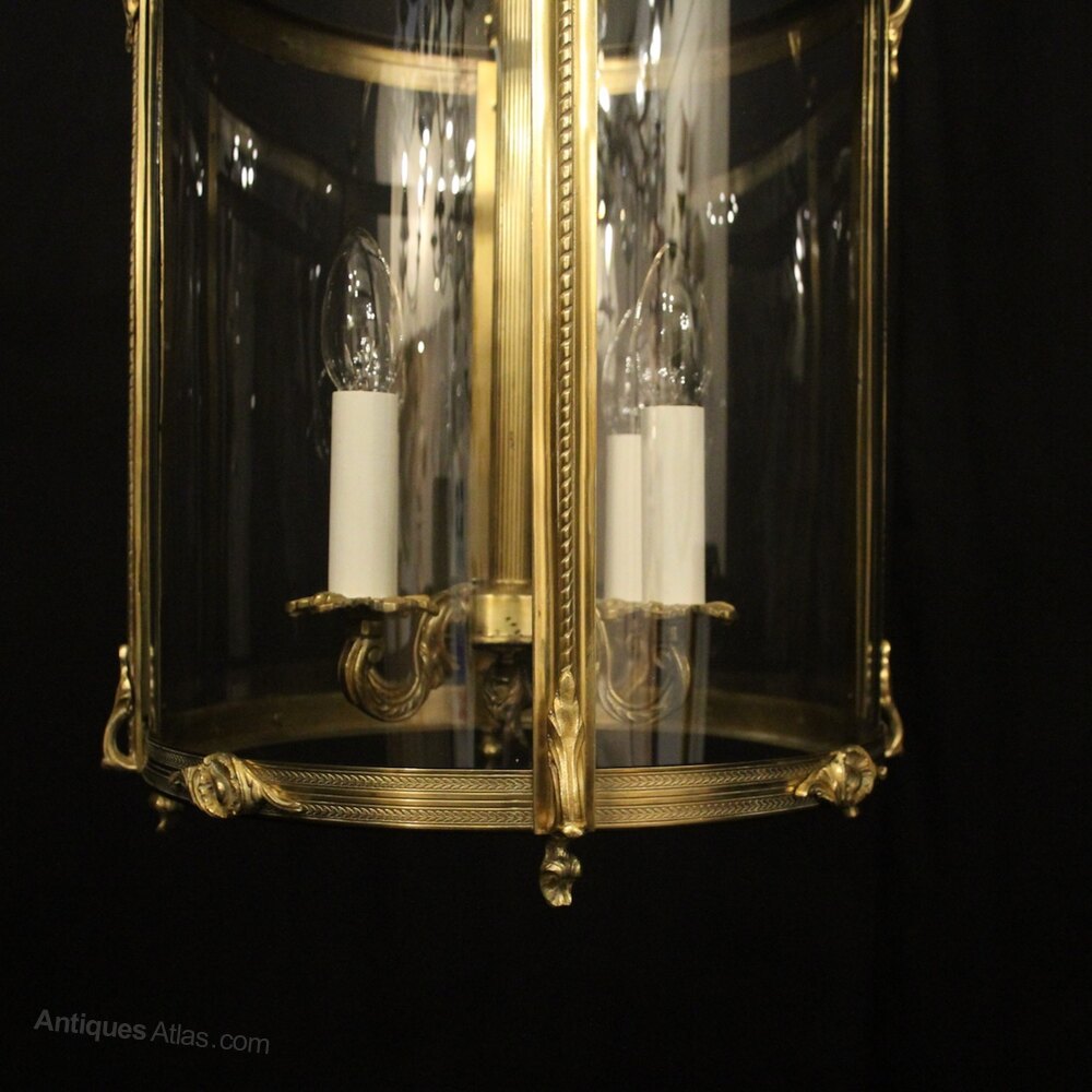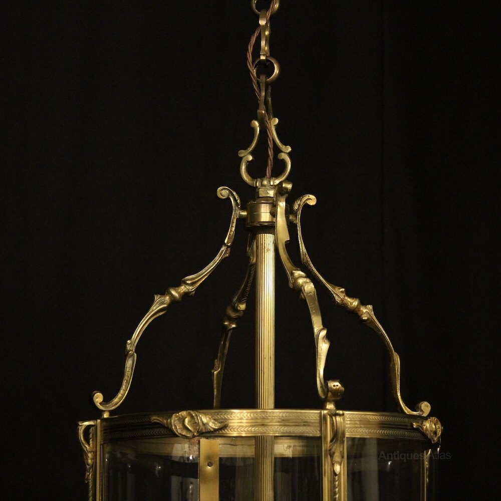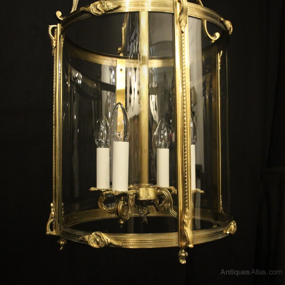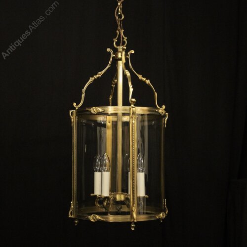 A large French gilded bronze four light antique hall lantern, the four ornate scrolling light fittings with leaf bobeche drip pans, surrounded by four sectional convex glass panels and held within an ornate scrolling framework with side reeded panels, decorative embellishments and open top scrolling canopy, having the original chain and ceiling rose, super original patination and a good large size. Fully rewired and PAT tested. All our lanterns come with bulbs and ceiling fixings.Dimensions: H: 30"/76cm W: 15"/38cm Excluding Chain & Rose