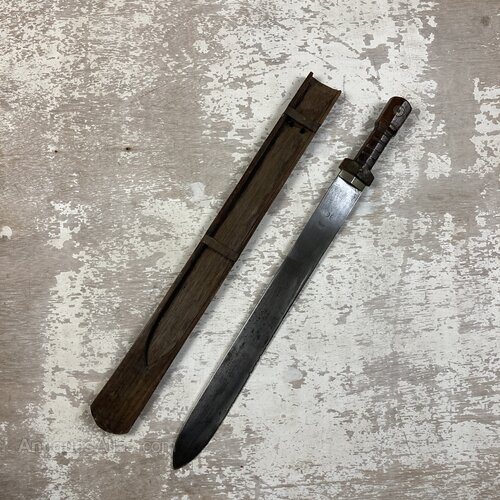A Ban sword from the Lepcha people of Sikkim state in India. Late 19th century.With typical open-sided scabbard. Indistinct inscription on blade.