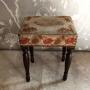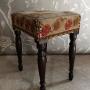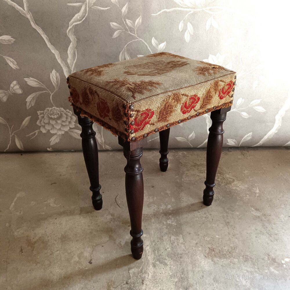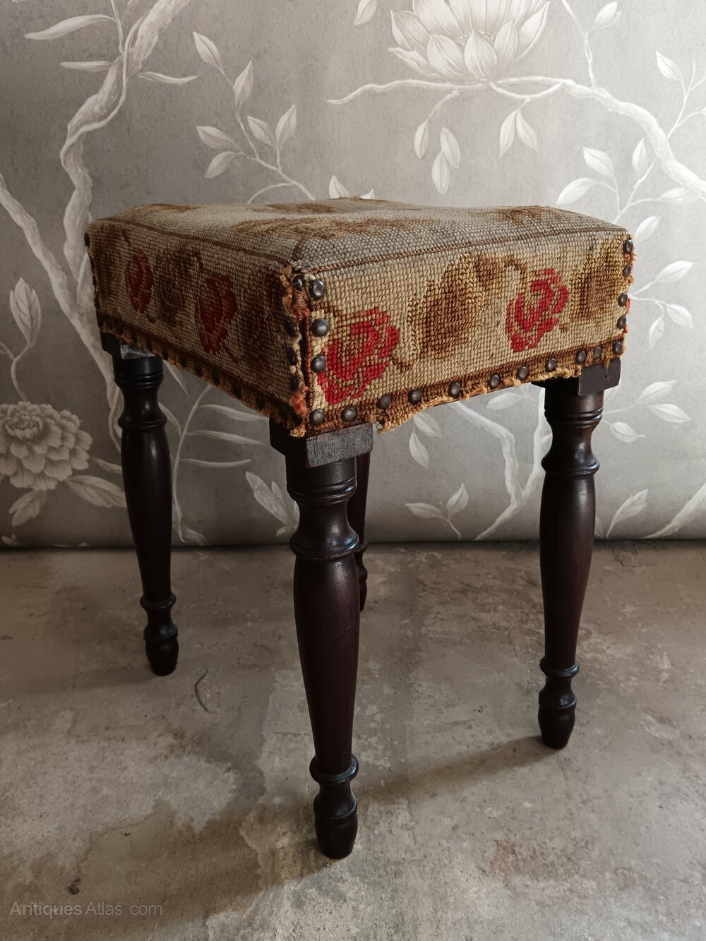 This Victorian mahogany stool features a traditionally upholstered seat, likely in its original needlepoint tapestry.The fabric shows wear and a small hole but displays an intriguing central mythical creature motif surrounded by leaves and leaves and roses to the fascia.