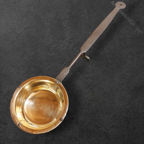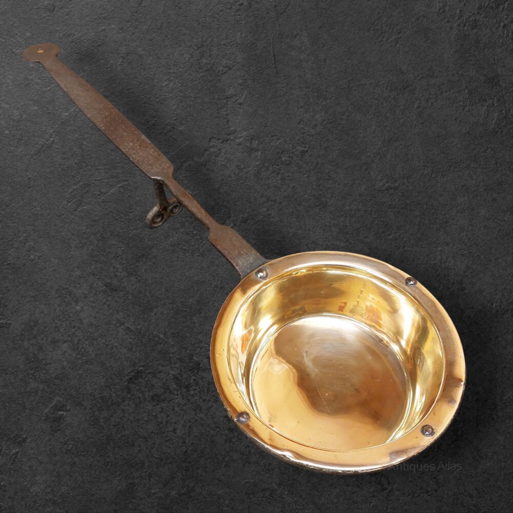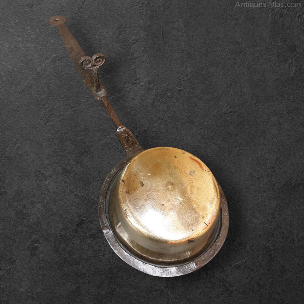A very good and rare early 18th century c.1720 Welsh Vernacular Down Hearth Skillet/Pan. Heavy gauge brass pan with wrought iron handle and rest. In very good condition and measuring 23 1/2" long. Pan is 6 7/8" diameter x 2 3/8" deep. Very useable. For use in the lower embers of a fire. Good polish and patina to the brass.UK MAINLAND DELIVERY INCLUDED IN PRICE.