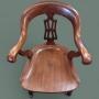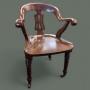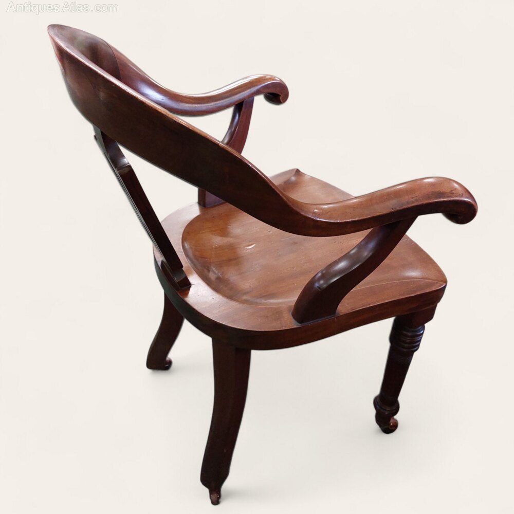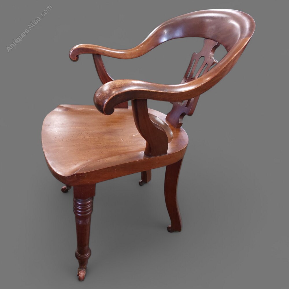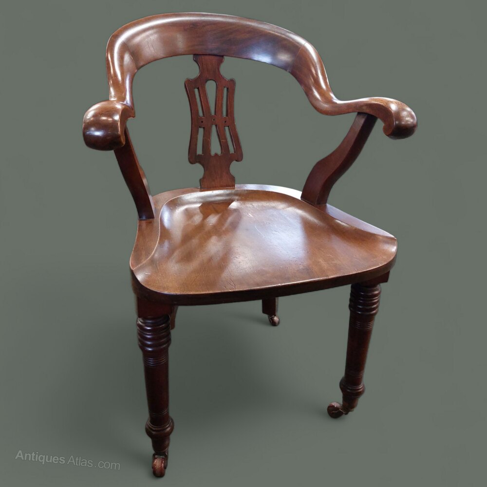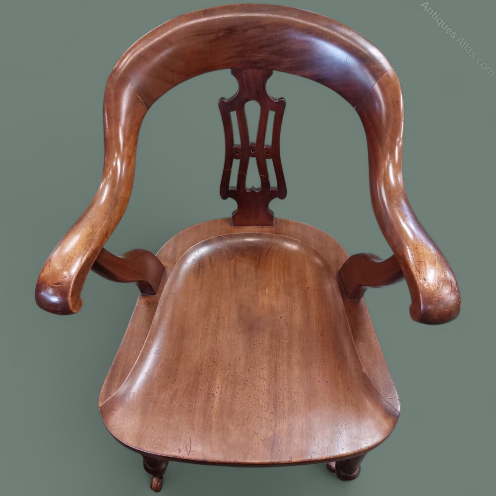 A splendid Victorian mahogany desk chair of the best quality and condition. Beautiful sweeping back and arms. Of generous proportions and very comfortable. All original finish and colour. Original castors. No loose joints. Stamped underneath the seat with a numerical number (probably Gillows). 23" wide x 26" deep x 35" high. Seat 20 1/2" deep x 20" wide. Seat height 18".UK MAINLAND DELIVERY INCLUDED IN PRICE.