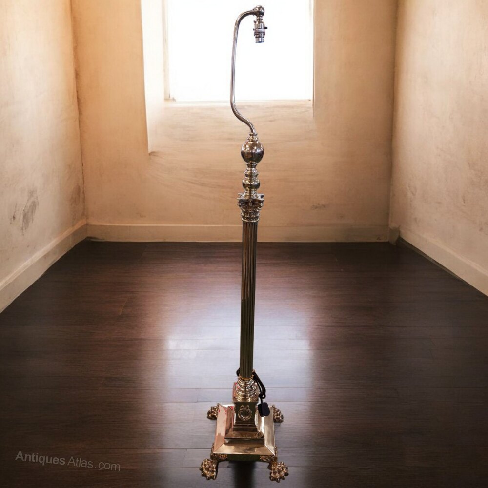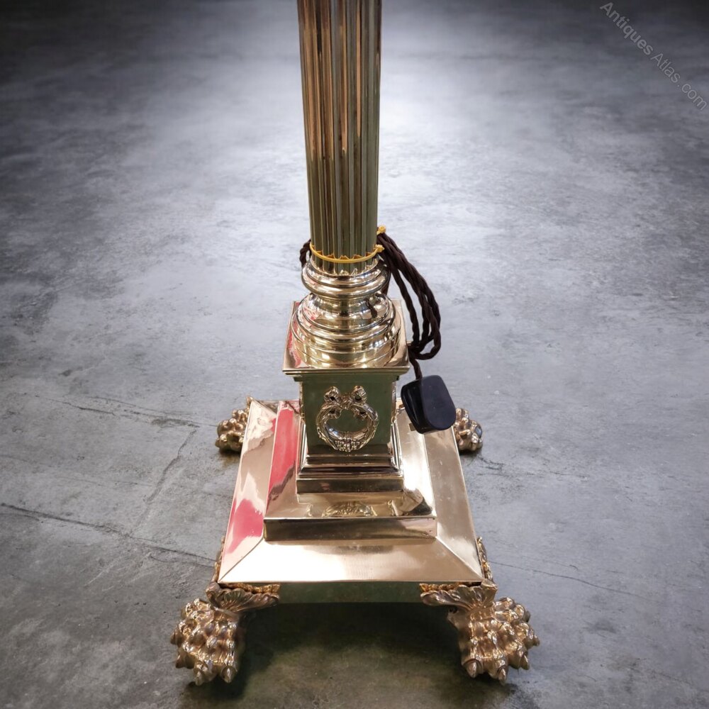 An unusual and rare model of an English Edwardian Country House polished cast brass Corinthian Column reading/floor lamp. Fully restored to a very high standard and rewired in old style braided flex. Ideal to be placed at the side of or behind your best armchair. Extremely heavy and standing on wonderful claw feet and embellished with cast cartouche to the bottom. 62" tall x 14" square base foot to foot. Circa 1910. Very good condition and ready to use with your choice of shade. I have the perfect Vaseline glass (uranium) Victorian shade available in perfect condition if wanted. (see pictures). Price without shade £850. Price with shade £1100.UK MAINLAND DELIVERY INCLUDED IN PRICE.