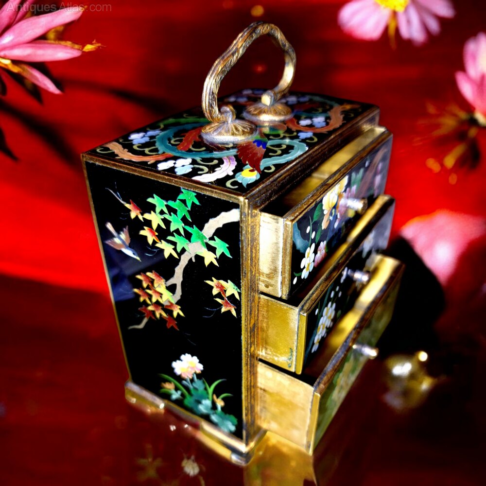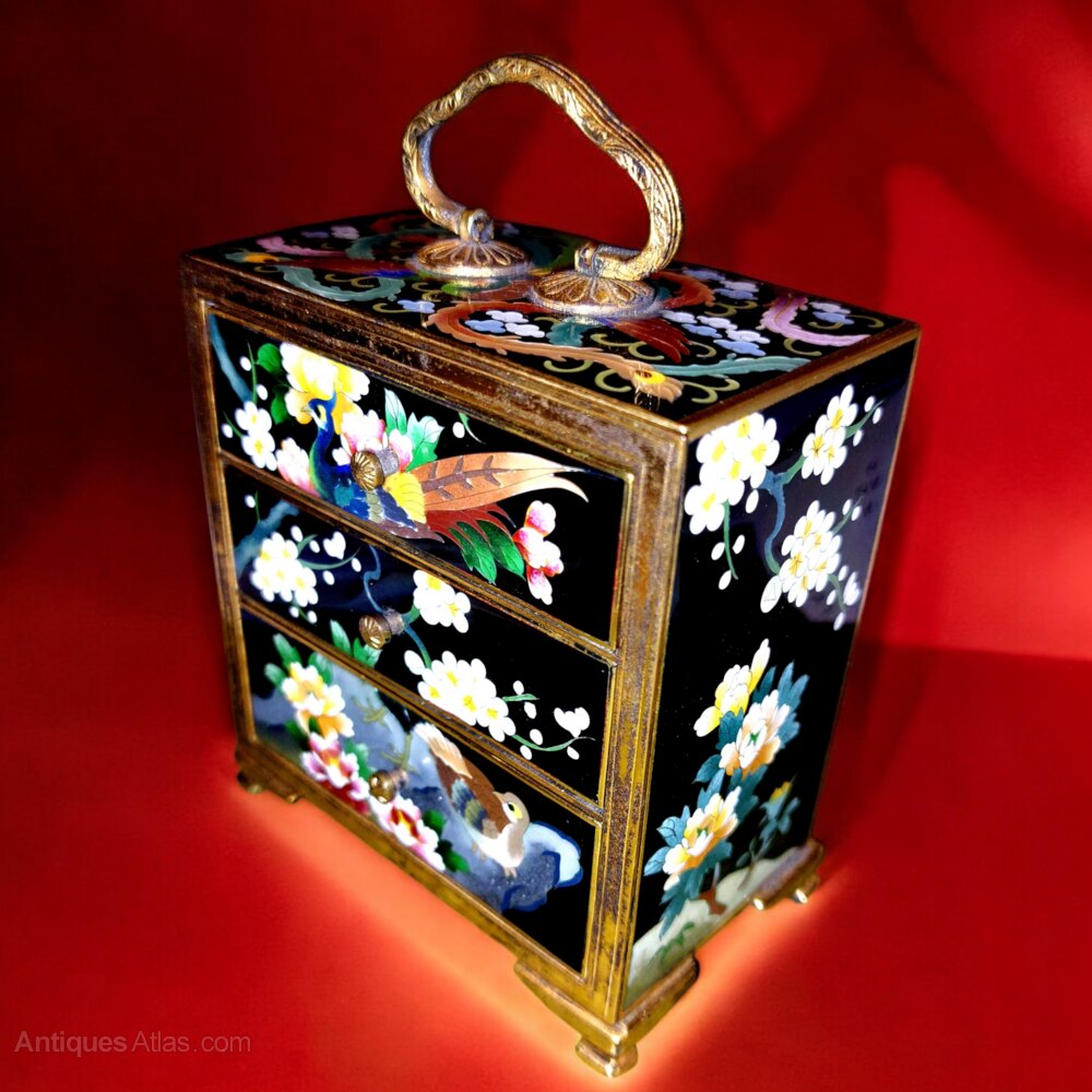 A very fine quality miniature Japanese Cloisonne Kodansu (chest) by the maker INABA. Dating to the late Meiji to early Taisho period the golden age of the finest quality cloisonne. Late 19th century to early 20th century. Very fine enamelling of birds and flowers with no restoration or damage whatsoever. Three small drawers fully gilded inside. Signed on the underside with the INABA monogram. Absolutely exquisite. 3 5/8" wide x 2 1/8" deep x 3 3/4" tall. 5 1/8" to top of handle.UK MAINLAND DELIVERY INCLUDED IN PRICE.