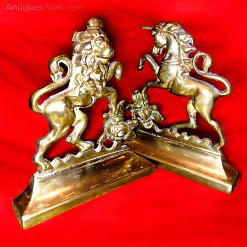 A very nice and well modelled pair of late 19th century to early 1900s solid cast brass the Lion and Unicorn fireside/mantel ornaments. Very well cast with the original polish and patina. Rare to find as ornaments usually bookends. Very good condition. 5 1/4" wide x 1" deep x 6" tall.UK MAINLAND DELIVERY INCLUDED IN PRICE.