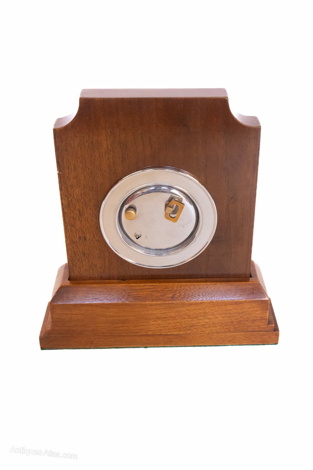 Art Deco Walnut & Chrome Mantel clock 1930sSilver face, Black numbers & hands Engine turned detail in centre,
