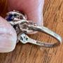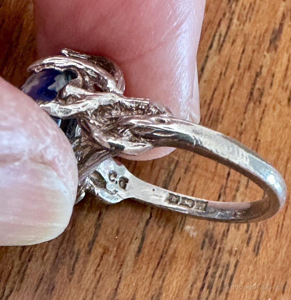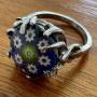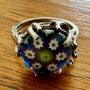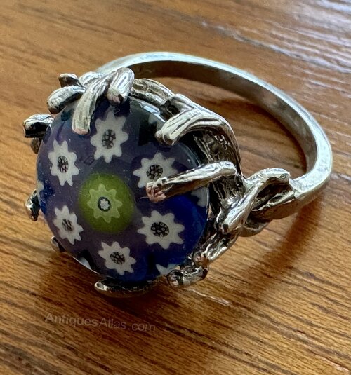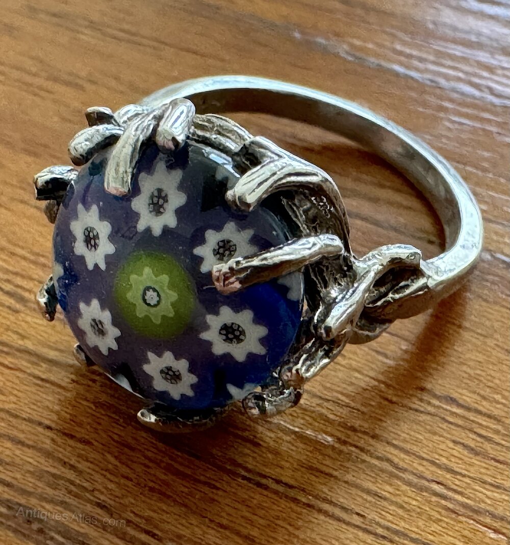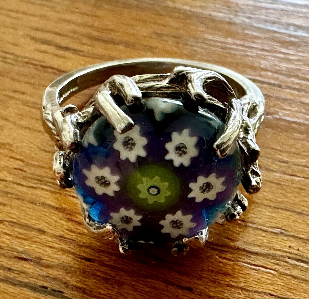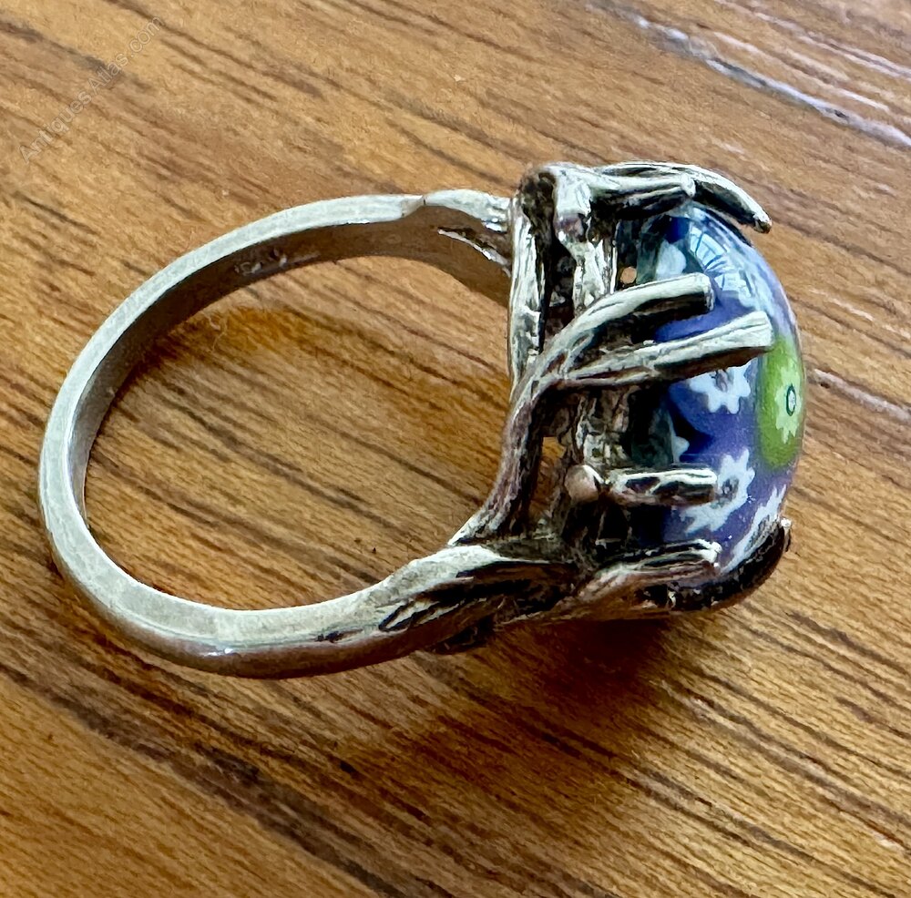 We have for sale a very striking Caithness glass Millefiori silver ring dating to 1974.This attractive and rather unusual size L Caithness Glass ring consists of an unusual branching setting housing a blue white and green floral glass Millefiori stone. The ring carries full British hallmarks for Birmingham.