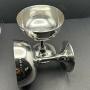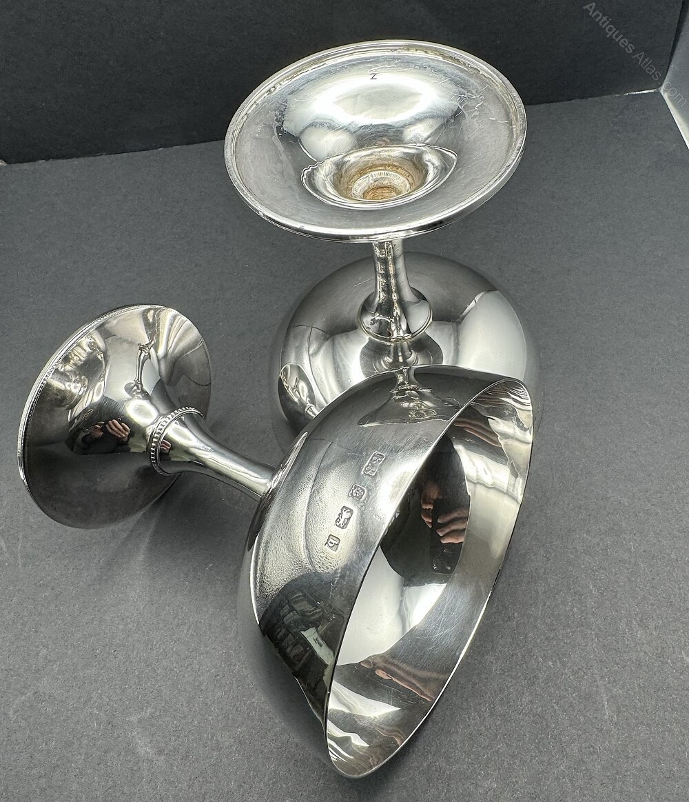 The champagne coupes are 4.1 inches (10.5cm) high, 3.5 inches (8.9cm) in diameter to the rim and a total weight of 9.7 Troy ounces. The coupes are in a very good to excellent Edwardian condition, the hallmarks and makers marks are clear, but to be fussy, careful inspection reveals the rims don't quite form a perfect circle.