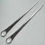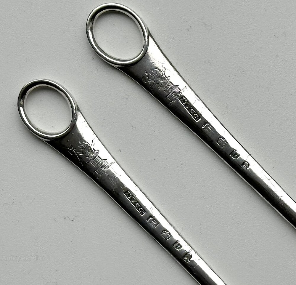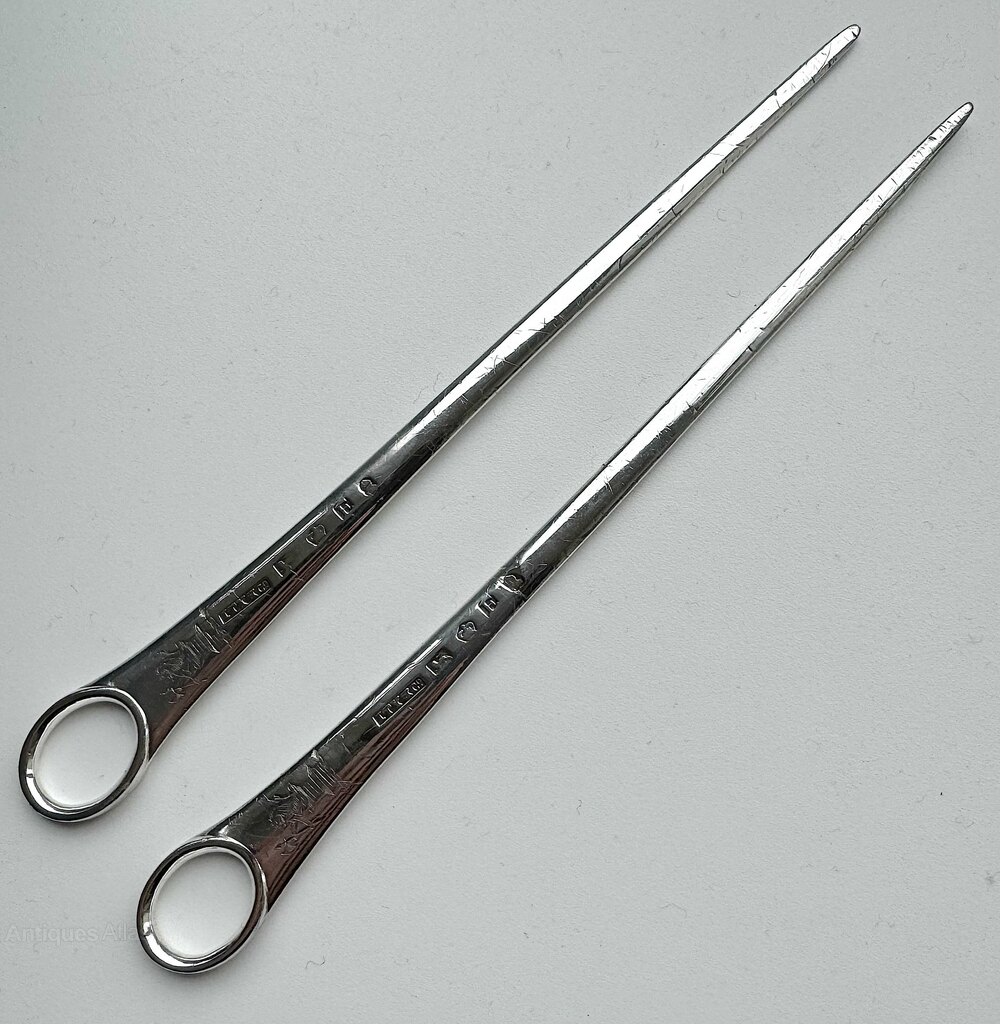 The skewers are 8.2 inches (20.5cm) long, weigh 49.9g and are in a very condition other than the knife cuts one would expect from late 18th century silver skewers and some rubbing to the mostly legible makers marks and hallmarks.