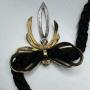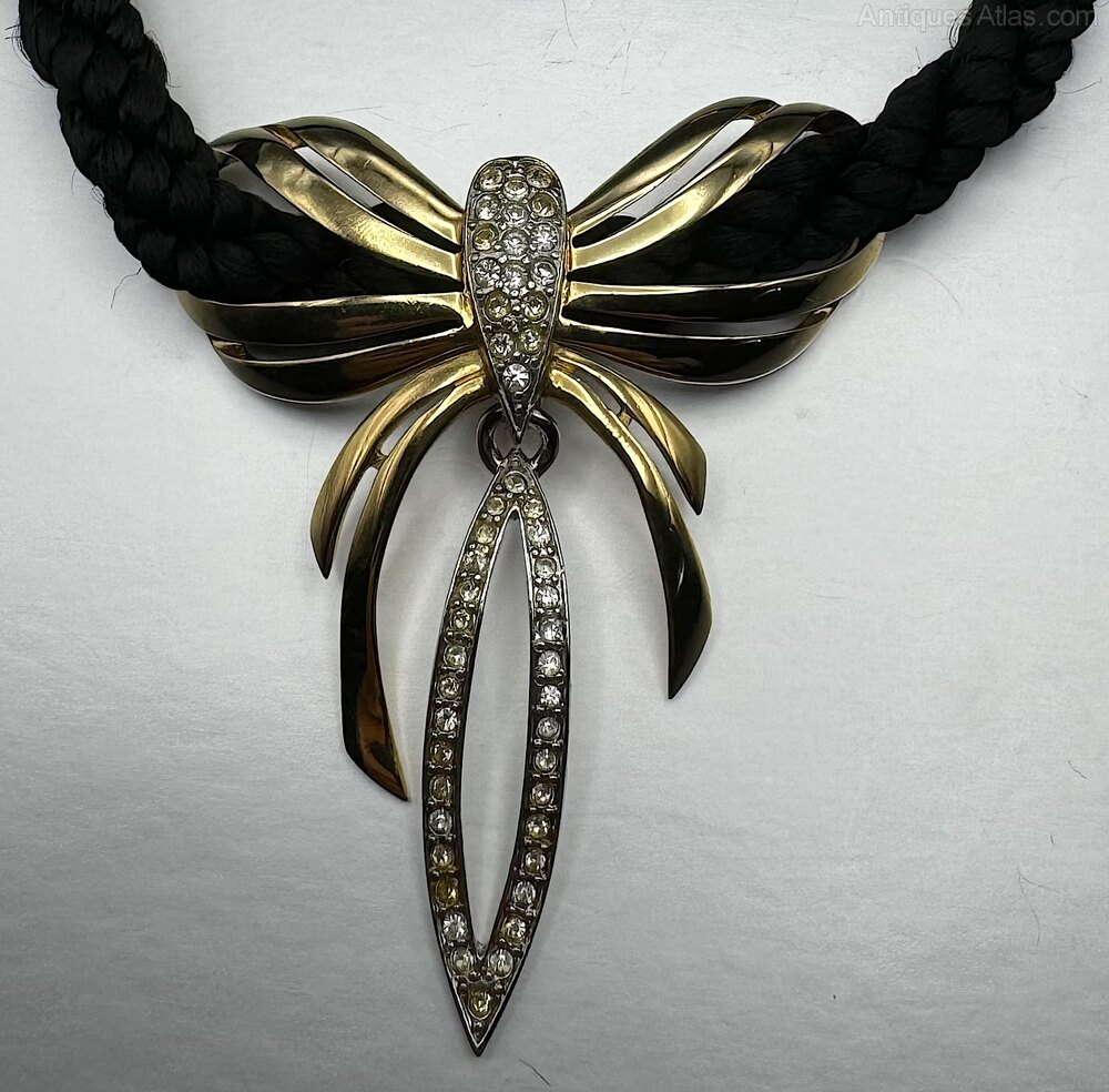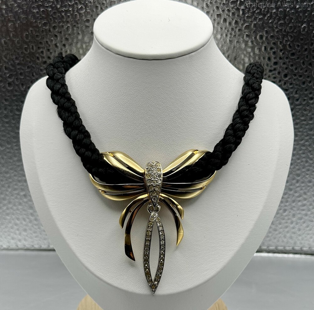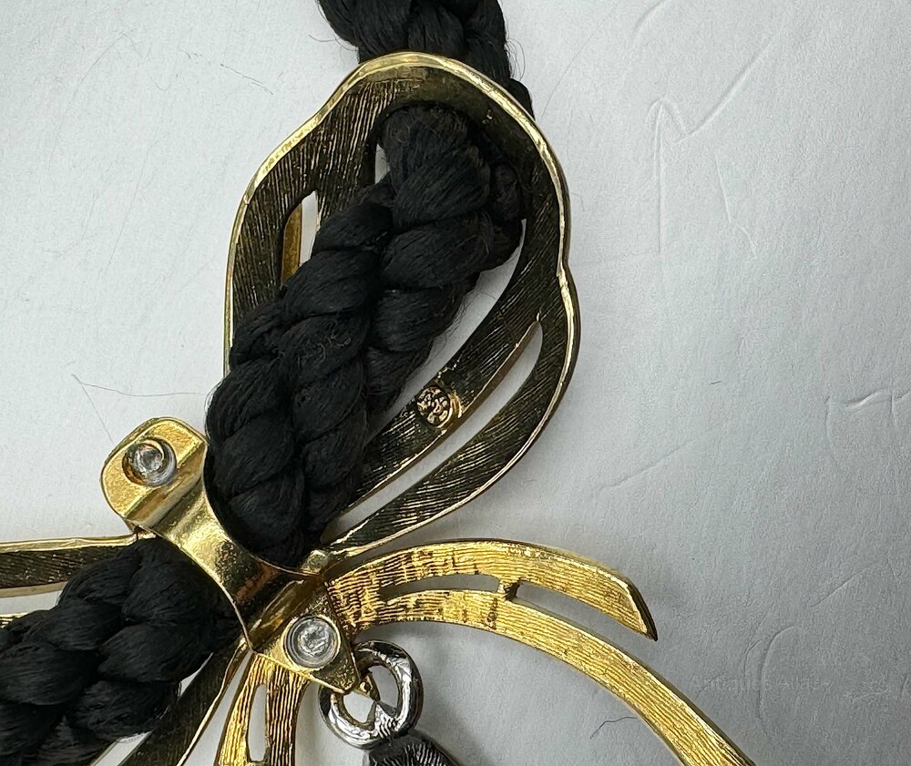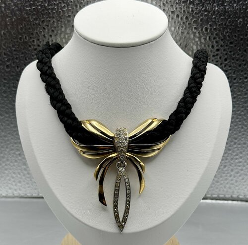 We have for sale the perfect gift a very striking 1980s statement piece Bergdorf and Goodman gold and silvertone plated rhinestone bow necklace.This rather stunning Bergdorf and Goodman necklace consist of a goldtone bow with a central rhinestone encrusted knot extending to a central rhinestone encrusted silvertone drop all mounted on a black cord band and finished with a Bespoke Bergdorf and Goodman goldtone magnetic necklace clasp. The back of the bow carries the entwined B and G Bergdorf and Goodman mark.