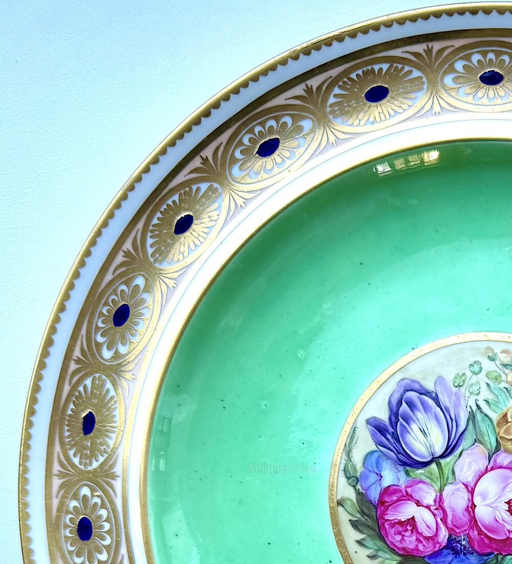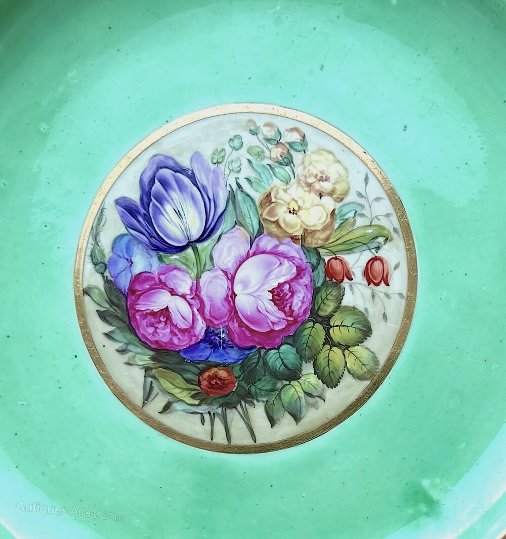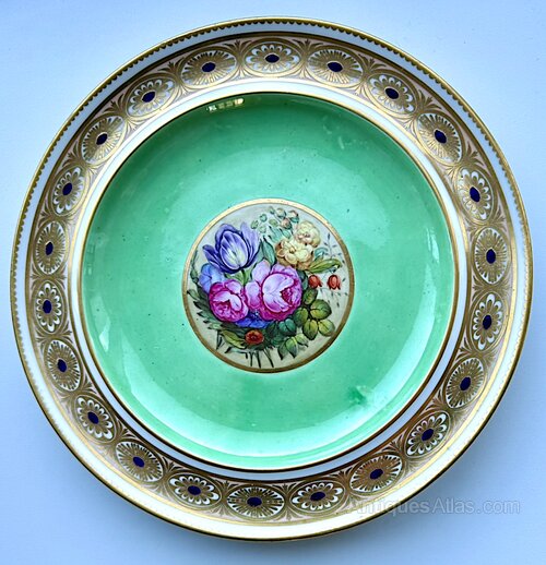 We have for sale a bit of a rarity, a Derby dessert plate c1795 the decoration of which is attributed to the derby decorator William Quaker Pegg. This is very much a plate for the collector of very rare Derby Porcelain.This derby desert plate is very hard to source and examples very seldom come to market. It is decorated with a gilt dentil rim around a wide band decorated with gilt floral motifs. Within this border, the central region is painted with an apple green ground around a central gilt bordered panel painted with roses and other flowers. The back of the plate carries a blue Duesbury mark along with a label indicating that the plate was item No 46 or 96 in the collection of the well known Deby porcelain expert, R.H. French. A similar plate was illustrated in the William "Quaker" Pegg Bicentenary Exhibition, 1813 - 2013, see the Derby Porcelain Society web site. This plate is one of only a few attributed to Quaker Pegg during his early career at Derby.