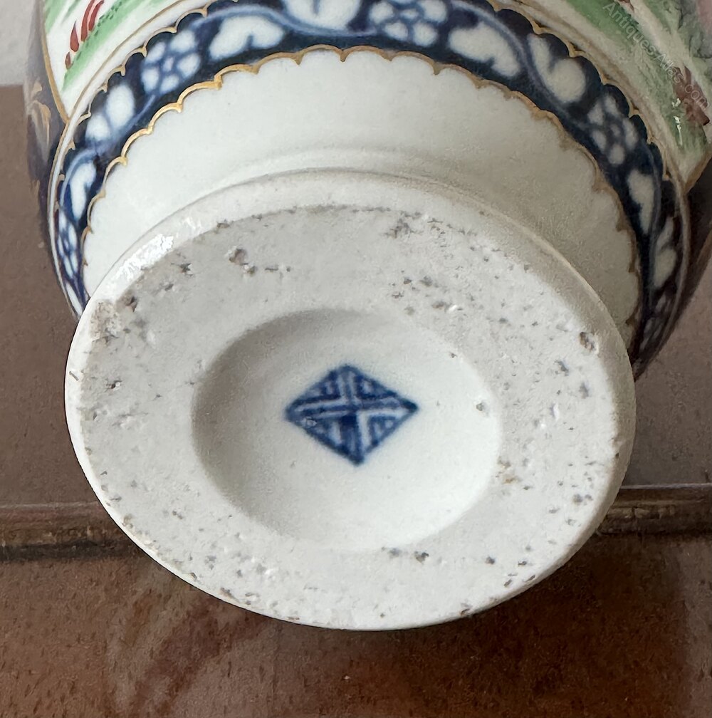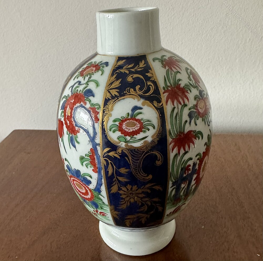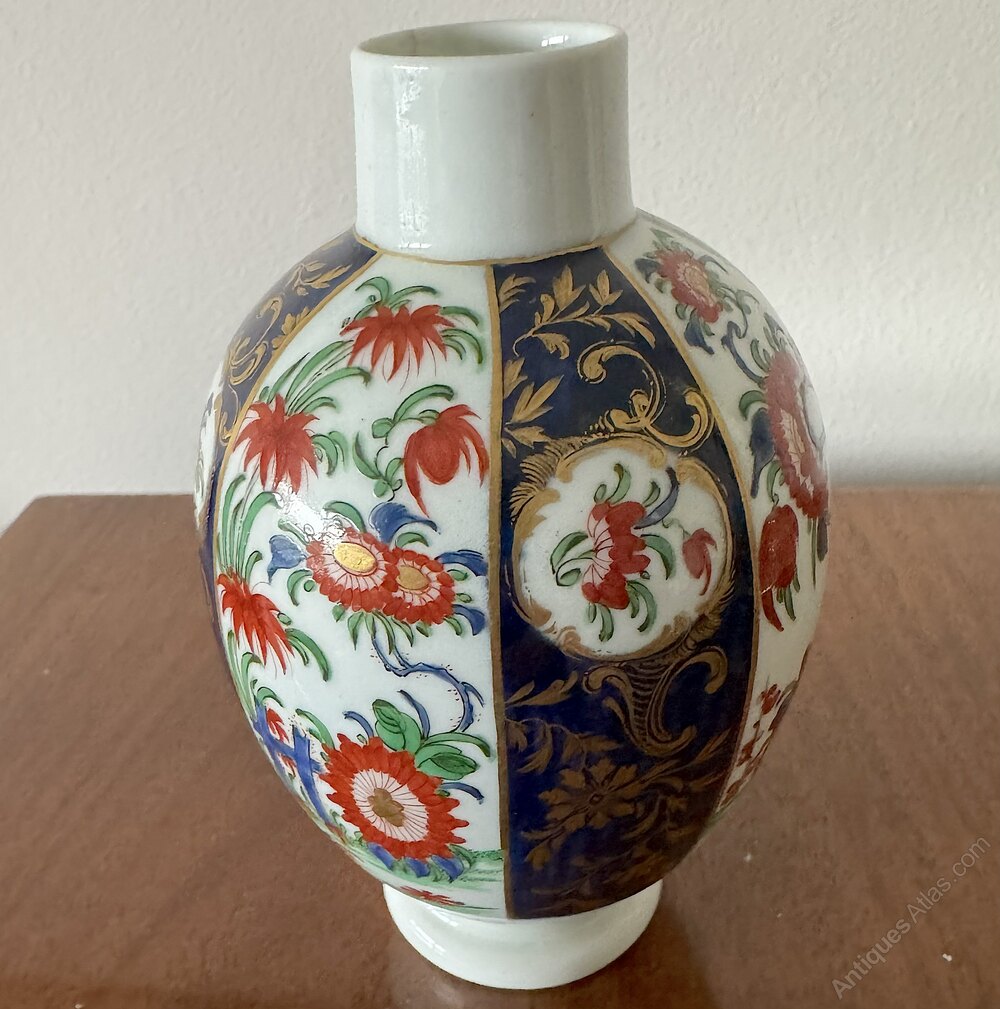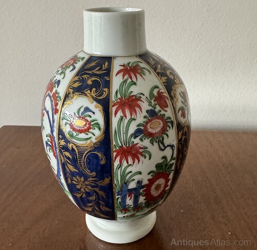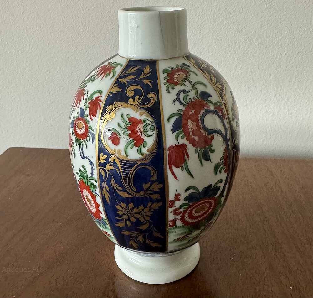 We have for sale a very attractive and rather hard to find 1st period Worcester Rich Queens pattern tea canister or tea caddy c1775.This lovely tea caddy is of an ovoid baluster form with the ovoid body decorated in an Imari style with vertical gilded panels alternately painted with chrysanthemums against a white ground and foliate gilded cobalt blue panels each containing a reserve decorated with chrysanthemums with leaves against a white ground. The base of the tea caddy carries the 1st period Worcester Pseudo square blue fret mark.